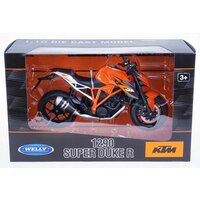 Коллекционный лицензионный мотоцикл WELLY 1:10 KTM 1290 SUPER DUKE R, оранжевый. Выполнен из металла die-cast с элементами пластика.
