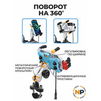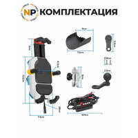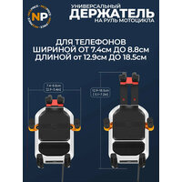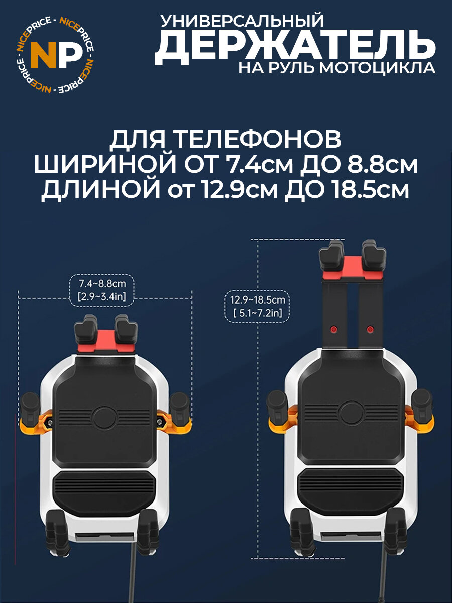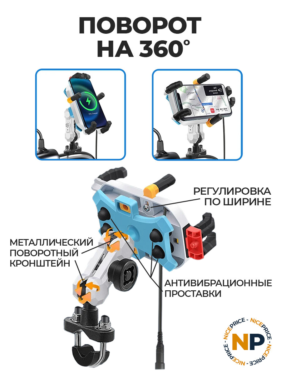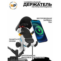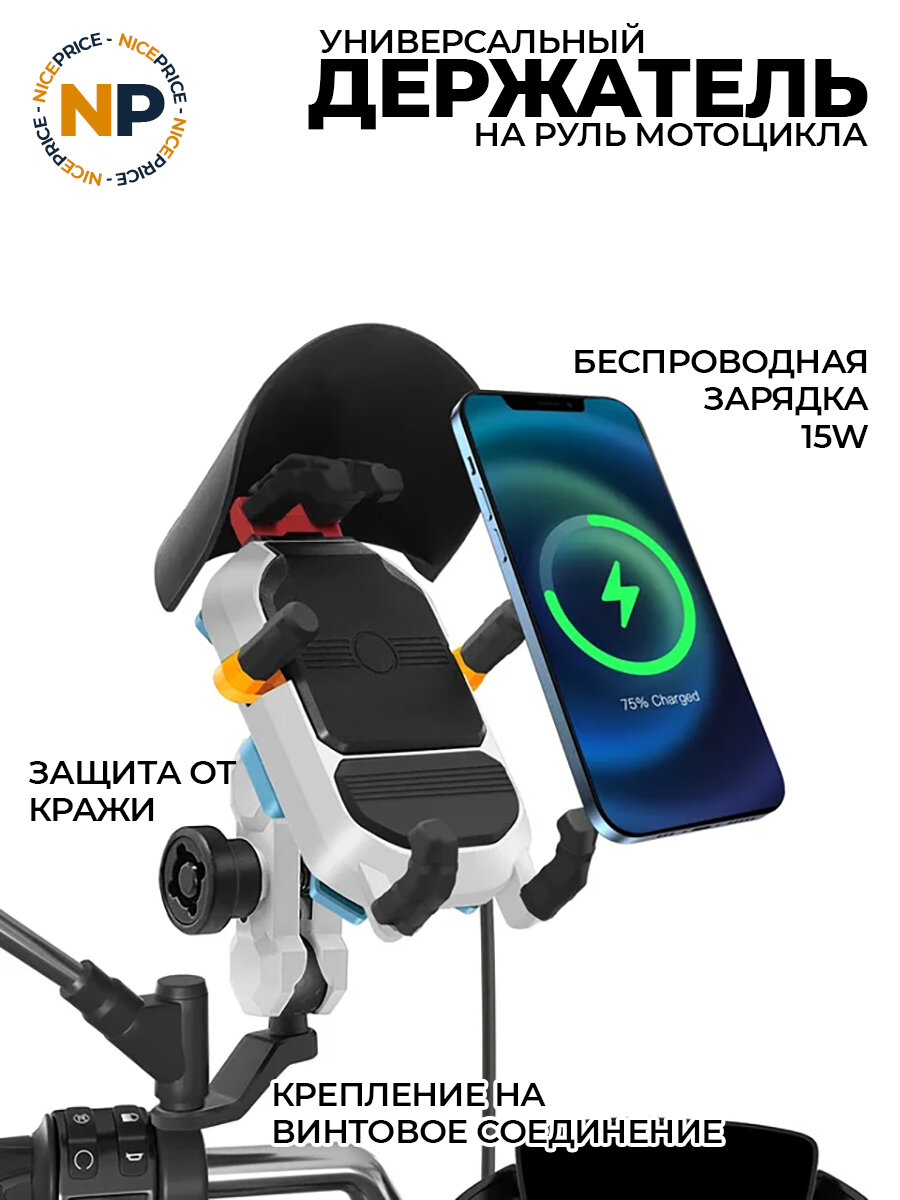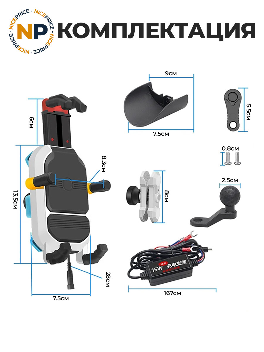 Крепление телефона / навигатора на руль мотоцикла с беспроводной зарядкой. Мотоциклетный держатель подходит для любого типа мототехники; Антивибрационные проставки сберегут камеру вашего смартфона от поломок; Мощность беспроводной зарядки до 15 вт; Съемный козырек от солнца. Высота телефона телефона от 12.9 до 18.5см; Ширина телефона от 7.4 до 8.8см Способа крепления: место крепления зеркала Питание 12-24в; Поворот 360 градусов; Длина провода 167 см.