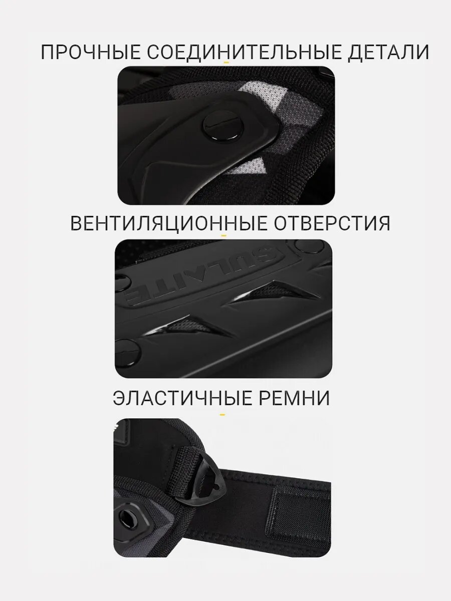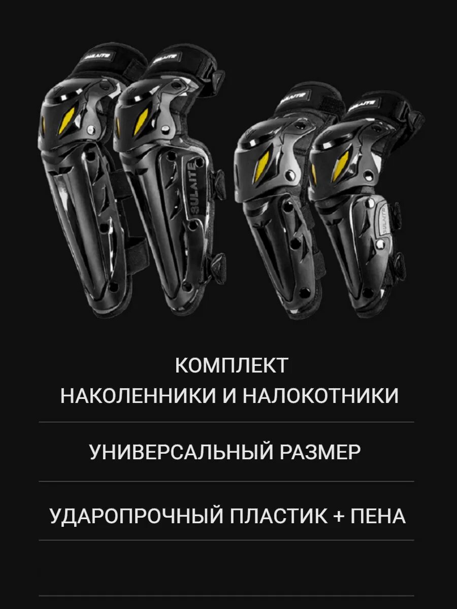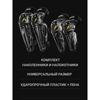 Комплект высокопрочной твердой защиты колен и локтей предназначен для байкеров и любителей кататься на высокоскоростных двухколесных видах транспорта. Наколенники имеют вытянутую форму, щитки защитят ткани голени. По тому же принципц сделаны и налокотники, предусмотрена защита предплечья. Удобная эргономичная форма повторяет изгибы тела. Анатомическая посадка обеспечит свободу движений. Внешний слой мотокроссовой экипировки выполнен из ударопрочного пластика, внутренний слой из амортизирующей пены, которая смягчает ударную силу. Размер универсальный, затягивается с помощью эластичных ремней и фиксируется замками. Пряжки с быстросъемной системой, это добавляет удобства в повседневном использовании. Корпус имеет вентиляционные отверстия для выведения лишней влаги, что позволяет использовать комплект мотоциклетной защиты в летнее, демисезонное и зимнее время. Мотонаколенники можно назвать мужскими или женскими, дизайн современный и универсальный. Предусмотрены светоотражающие жёлтые вставки для повышения Вашей безопасности в ночное время. Широко применяются при катании на скутере, электросамокате или трюковом велосипеде. Любой вид активности в этом наборе защиты будет безопасным и комфортным. Набор изготовлен на специализированной фабрике Китая, товар прошел сертификацию безопасности Европейского Союза SGS защиты уровня CE1, пройдя испытание на ударопрочность.