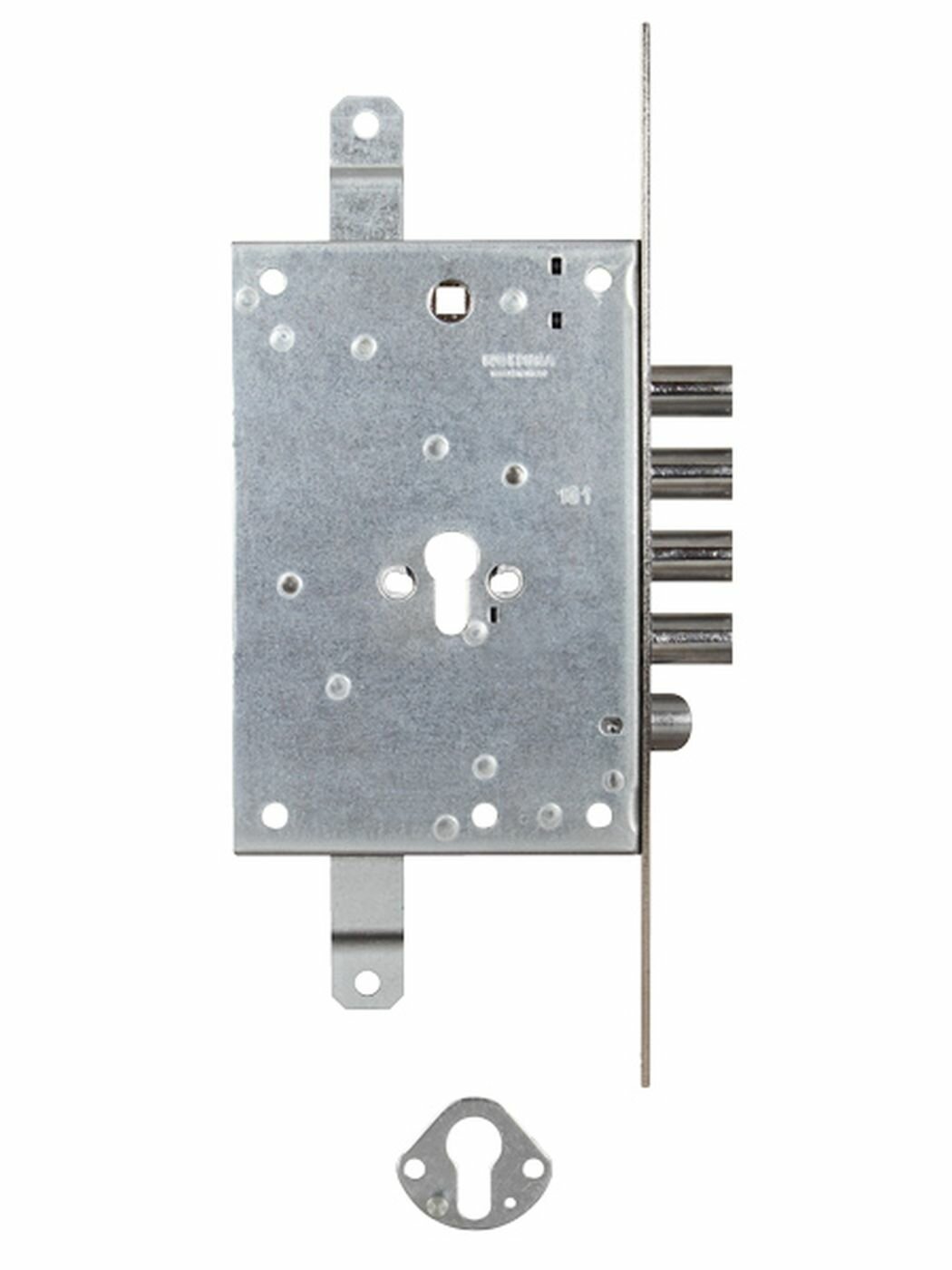 Корпус врезного замка 85.971 S с тремя точками запирания для цилиндрового механизма с защелкой предназначен для левосторонних дверей. Реверсивная защелка диаметром 20 мм приводится действием цилиндром и фалевой ручкой. Бэксет 66 мм. Ход 4 круглых ригелей диаметром 18 мм. Вылет ригелей - 30 мм. Межосевое расстояние 85 мм. Ход тяг 20 мм.