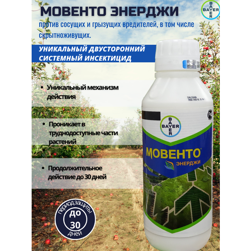 Мовенто Энерджи - системный инсектицид с широким спектром действия для контроля всех видов сосущих, скрытноживущих насекомых и грызущих, таких как тли (в том числе филлоксеру), трипсы, червецы и щитовки, белокрылки, листоблошки, жуки и листовертки. Помимо контроля насекомых Мовенто Энерджи сдерживает развитие клещей и нематод.