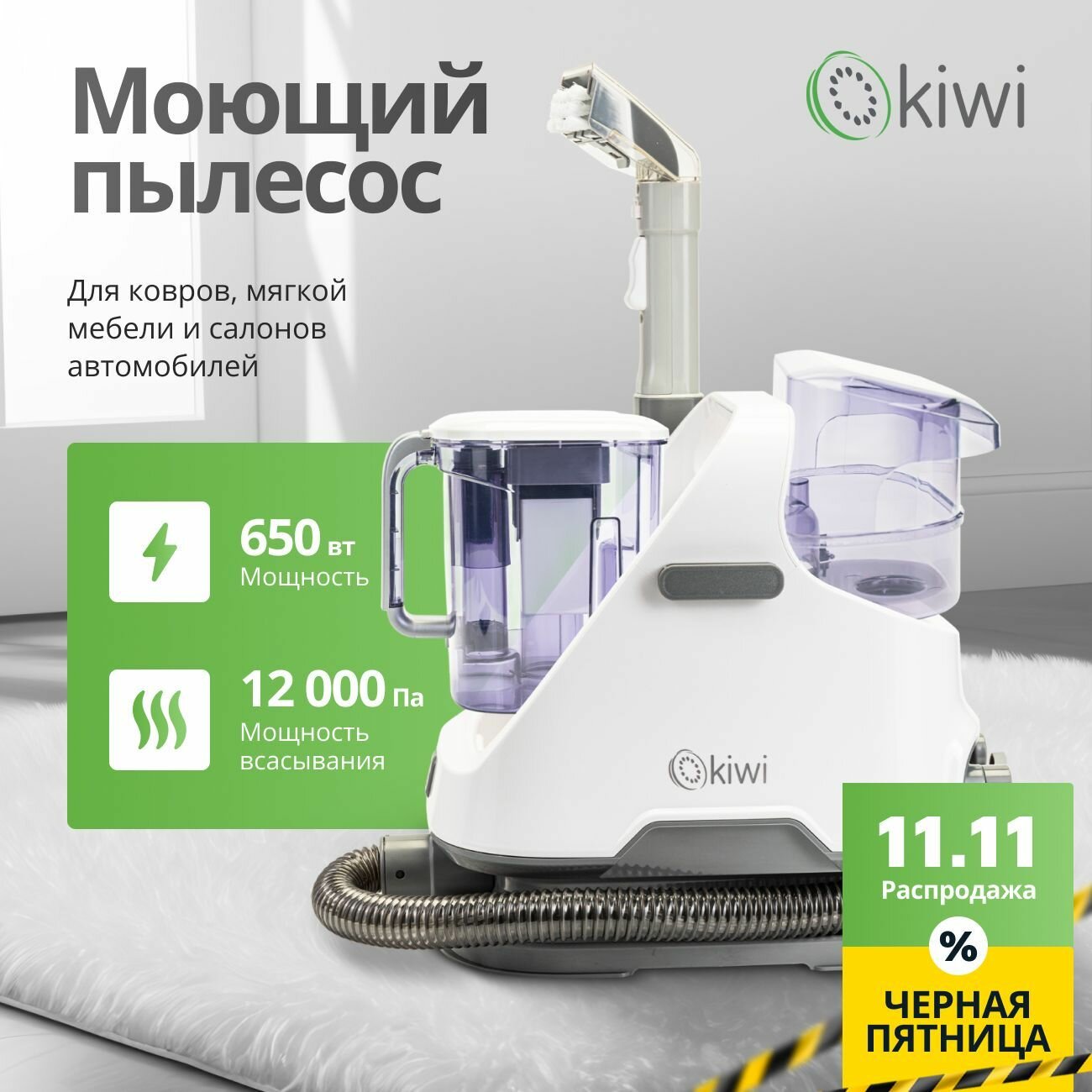 Моющий пылесос KIWI KCC-4320 для химчистки ковров, мягкой мебели, салона авто, мягких игрушек, всех видов загрязнений