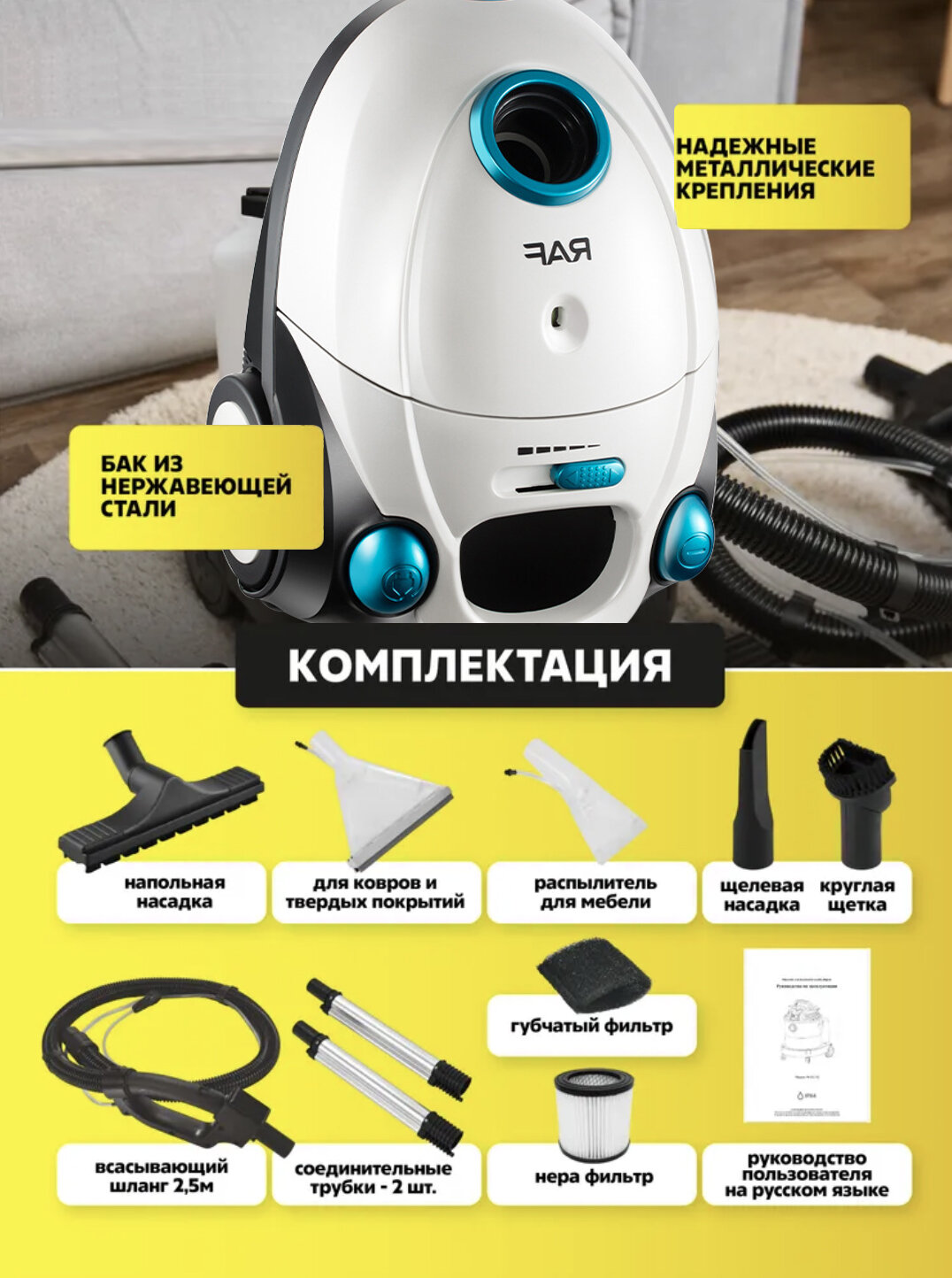 Купить Моющий пылесос для дома и химчистки, с мощным мотором, аквафильтром, для ковров и мебели. с доставкой по всей России.