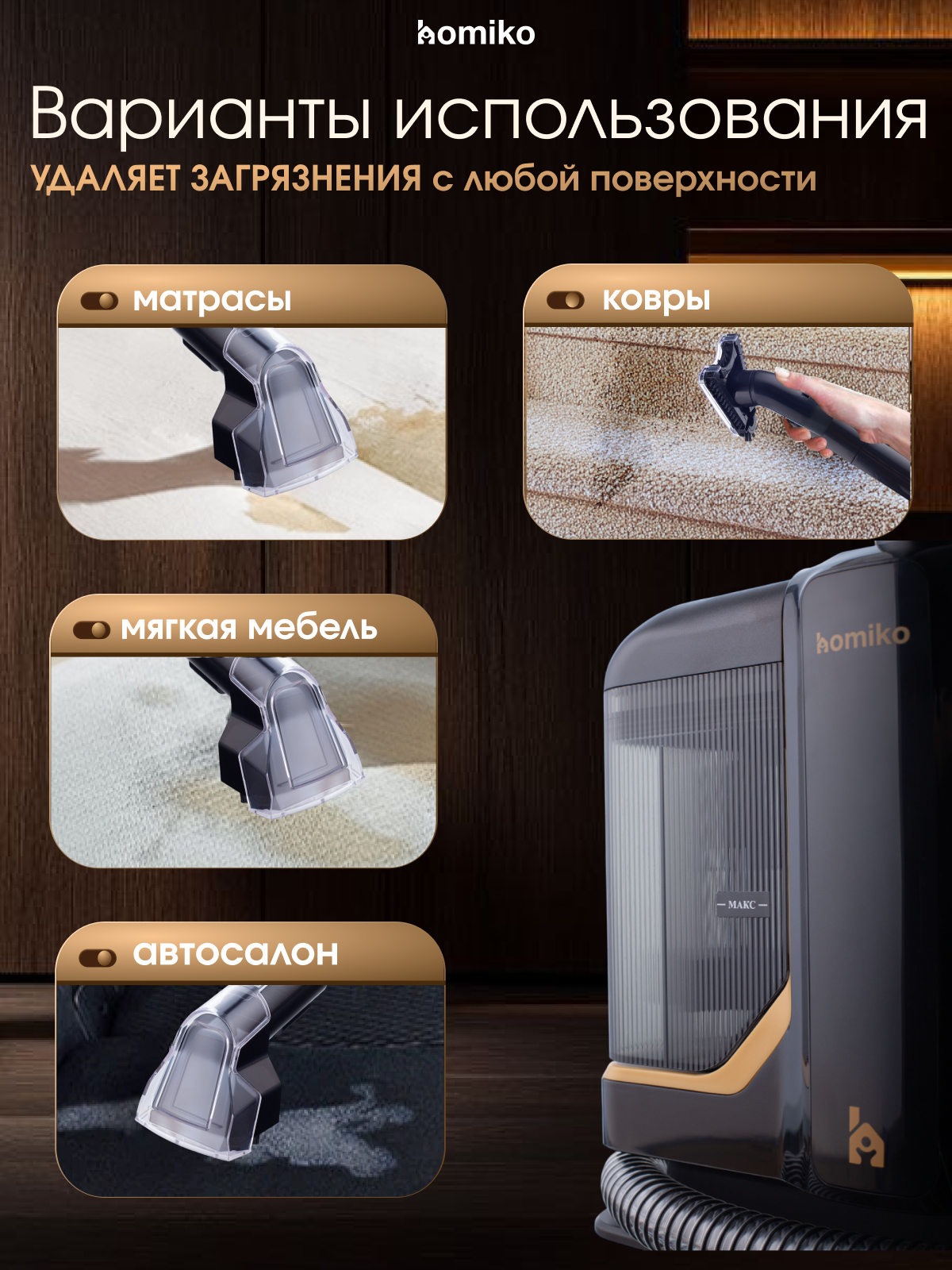 Купить Моющий пылесос Homiko VCC-04, мощность 750Вт, для мебели, ковров, авто с доставкой по всей России. Моющий пылесос Homiko VCC-04, мощность 750Вт, для мебели, ковров, авто: сравнение цен, характеристики, фото, актуальное наличие и цены.