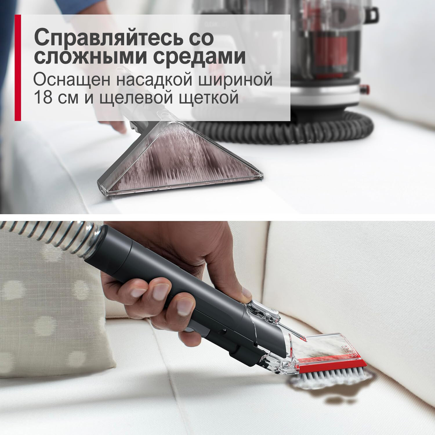 инструменты для любого загрязнения: Эта машина для удаления пятен и обивки справится с загрязнениями любого размера. Широкий инструмент 18 см быстро очищает большие площади, а инструмент TightSpot достигает в щели и труднодоступные места.
