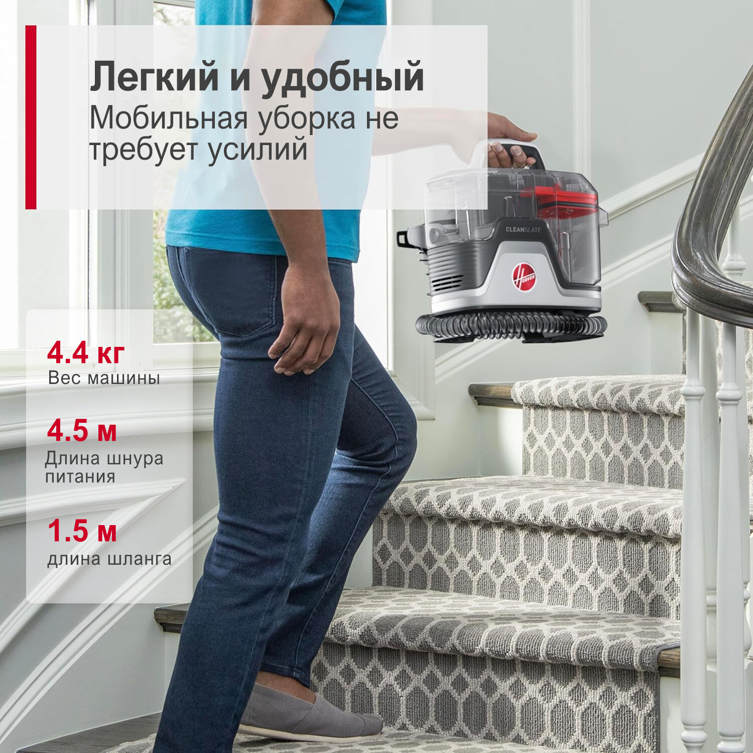 Портативная машина для чистки ковров: Быстро удаляйте пролитые жидкости и справляйтесь с трудными загрязнениями, такими как грязь, вино, следы от животных и многое другое с помощью машины для чистки ковров Hoover CleanSlate Plus. Включает пробный окси-клининг раствор.