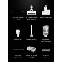 | Дополнительная информация | Комплектация: основной корпус с электрощеткой в сборе, съемная аккумуляторная Li-ion батарея, модуль ручного пылесоса с пылесборником, зарядная база, держатель насадок 1, держатель насадок 2, насадка для мебели 2 в 1, труба с ручкой, мини турбо-щетка, адаптер зарядки, мини щетка для чистки валика, щетка для чистки трубы, инструкция по эксплуатации |
