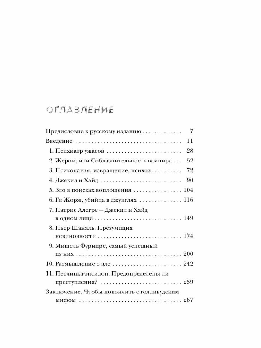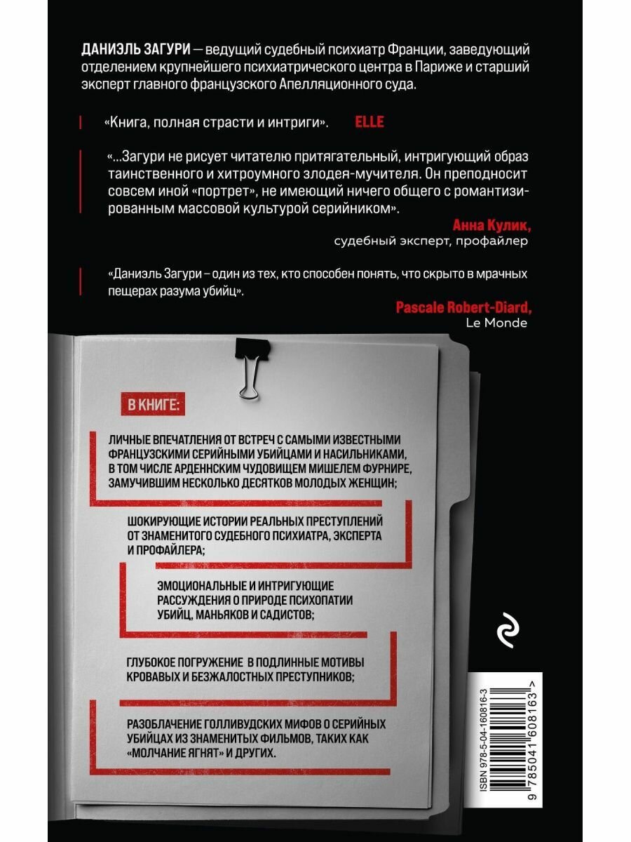 Даниэль Загури — ведущий судебный психиатр Франции, заведующий отделением крупнейшего Психиатрического центра в Париже и старший эксперт главного французского Апелляционного суда.В книге:- личные впечатления от встреч с самыми известными французскими серийными убийцами и насильниками, в том числе, Арденнским чудовищем Мишелем Фурнире, замучившим несколько десятков молодых женщин;- шокирующие истории реальных преступлений от знаменитого судебного психиатра, эксперта и профайлера;- эмоциональные и интригующие рассуждения о природе психопатии убийц, маньяков и садистов;- глубокое погружение в подлинные мотивы кровавых и безжалостных преступников;- разоблачение голливудских мифов о серийных убийцах из знаменитых фильмов, таких как «Молчание ягнят» и других.От грубой жестокости до вампирских фантазий.