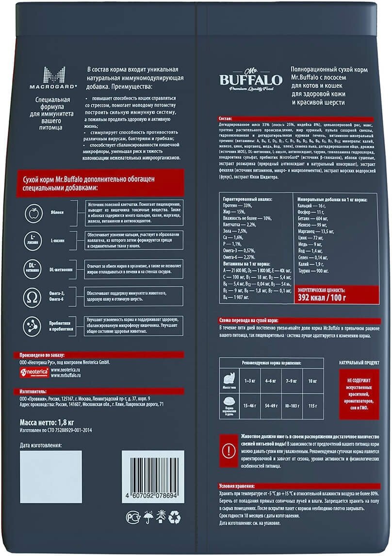 | Минеральные вещества | Витамин А, МЕ/кг 21 600 Витамин D3, МЕ/кг 1800 Витамин E, мг/кг 400 пищевые добавки Омега-3, % 0,41 Омега-6, % 2,49 Витамин B1, мг 18 Витамин B2, мг 5,4 Витамин В3, мг 54 Витамин В4, мг 1987 Витамин В5, мг 9 Витамин В6, мг 5,4 Витамин В7, мг 0,1 Витамин В9, мг 1,8 Витамин В12, мг 0,04 Витамин K, мг 0,18 Витамин C, мг 100 Бетаин, мг 604 Железо, мг 99 Марганец, мг 13,5 Цинк, мг 72 Медь, мг 9 Йод, мг 1,4 Селен, мг 0,14 Калий, г 1,87 Таурин, мг 900 DL-метионин, мг 1000 Глюкозамин, мг 300 Хондроитин, мг 200 |