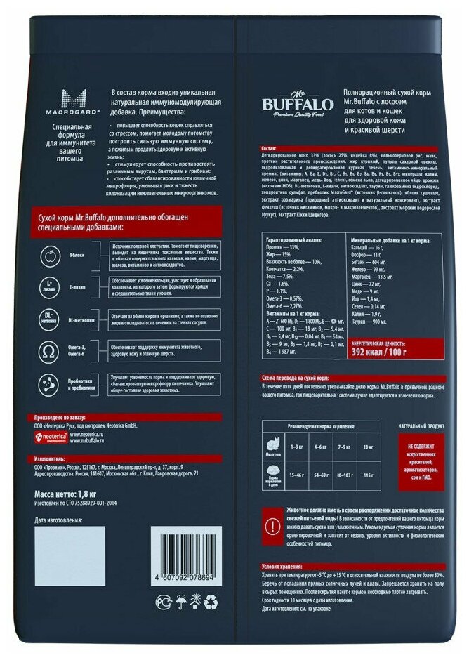 | Дополнительная информация | Полнорационный сухой корм Mr. Buffalo с лососем для взрослых кошек и котов с чувствительной кожей. Содержит высококачественные ингредиенты и все необходимые питательные вещества, включая витамины группы В, витамин Е, цинк, клетчатку. За счет сбалансированного содержания Омега-3 и Омега-6 жирных кислот, эффективность которых доказана клиническими испытаниями, корм способствует поддержанию... |