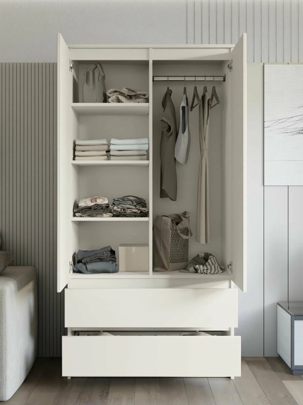 Купить МС Мори Шкаф МШ 900.1 Сатин (для одежды, распашной, в прихожую, в спальню, в детскую, с ящиками, с полками, со штангой) с доставкой по всей России.