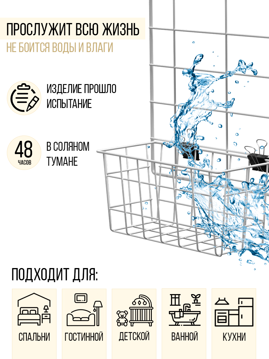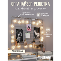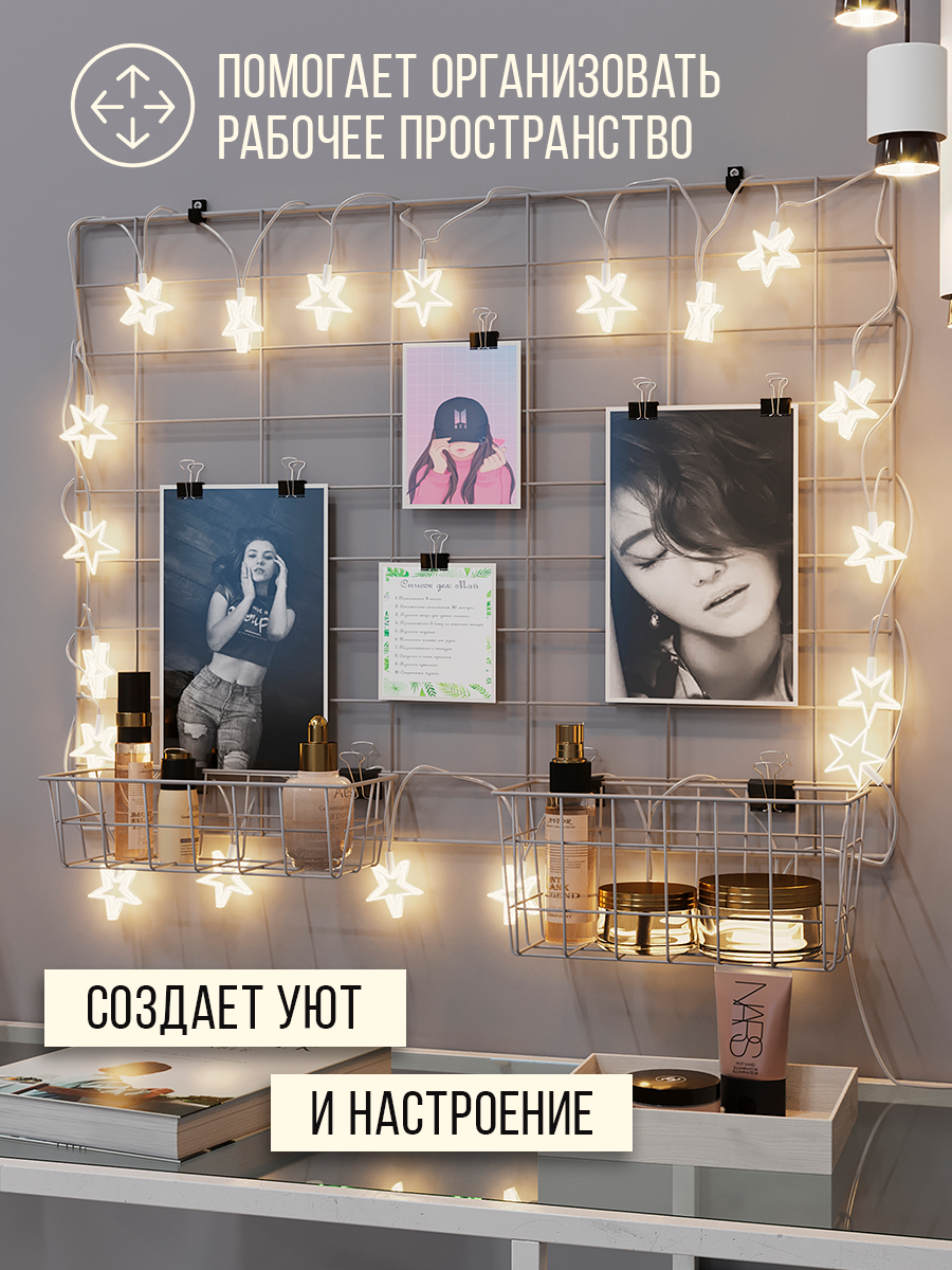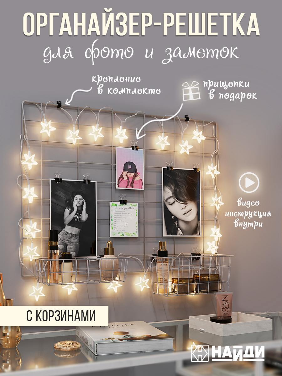 Для тех, кто хочет оформить стену и освежить интерьер квартиры или дома, мы предлагаем великолепный настенный держатель с корзинками в виде решетки от бренда найди. Большой органайзер подходит для оформления комнаты с помощью фотографий, картинок, вырезок. В набор входят все 10 необходимых предметов для сборки: мудборд, клипсы, зажимы для бумаг, комплектующие для сборки и крепления на стену. Система держателя выполнена в виде подвески с решеткой, которую можно оформить в виде свадебного фотоальбома, стены желаний, карты мечты. На железную рамку можно повесить любимые постеры, информационные плакаты, несколько записок в качестве быстрых напоминалок, красивые картинки, украшения. Стальная основа держателя - растяжки подходит для оформления декоративного панно, подвешивания студийных фотографий в творческой мастерской, карточек с необходимой информацией, забавных коллажей. Вы можете распечатать снимки любого размера и формата, крепкие прищепки надежно зафиксируют их на решетке, что поможет создать свой неповторимый стиль в комнате. Универсальная модель держателя сочетается с любым интерьером и разной мебелью. Органайзер подойдет для оформления комнаты в стиле лофт, уголка для детей и впишется в любое маленькое помещение нестандартного размера. Это отличный подарочный вариант, которые подарит незабываемые, эмоциональные воспоминания его обладателю. В ассортименте цвет черный и белый муар. Что делает дом уютным, придает ему индивидуальный шарм и отпечаток личности хозяина? Декор, милые вещи и различные мелочи оживляют комнаты дома, внося разнообразие. Подвесной держатель от бренда Найди прямоугольной формы из высококачественного проволочного металла размером 65х45 см с креплениями доступен к заказу в цветах белый матовый, черный матовый. Мудборд или доска для заметок отлично разместится над столом в детской комнате квартиры, на него ребенок с удовольствием разместит милые рисунки, фотографии, канцелярские бумаги и прочие важные мелочи. Легкая и прочная модульная сетка не только нужный и полезный аксессуар, но и эстетика в дизайне комнаты подростка - школьника: девочки или мальчика. А студенту комнатная компактная стенка для записей просто жизненно необходима. Настенная панель фотостена заменит целый домашний фотоальбом. Количество фоток вы определяете сами. Навесной настенный органайзер с черным покрытием станет стильным украшением гостиной, кабинета или кухонного пространства в стиле лофт. Вы сможете разместить на решетке открытки, напоминания для взрослых, очки, украшения, небольшие растения или другие предметы. Универсальный органайзер может функционально украсить любую комнату в доме – кухню, ванную, гостиную, спальню. На даче секция - решетка не только выполняет функцию системы хранения мелкого инвентаря, но и как композиция выступает в качестве украшения интерьера. Ваше дачное, несомненно нужное добро, размещенное на сеточку, будет всегда на виду. В офисе эстетичный декоративный держатель служит не только украшением пространства, но это еще и нужная вещь в организации рабочего порядка. На ней полезные маленькие записи не потеряются и передача дел - записок коллегам будет простой и надежной. В кафе или мастерской сетчатая панель - планер послужит фиксатором рабочего процесса и важные элементы будут все