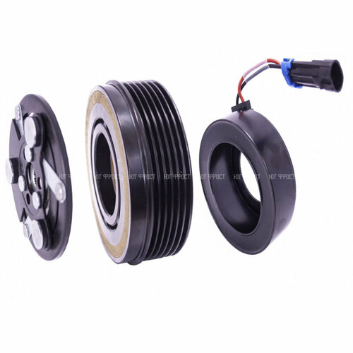 Муфта электромагнитная это узел, который устанавливается в передней части компрессора и состоит из электромагнитной катушки, шкива и прижимной пластины. Когда на катушку подается питание, она создает магнитное поле, которое притягивает прижимную пластину к шкиву, приводя в движение вал компрессора. В результате чего на вал передается крутящий момент и компрессор начинает нагнетать хладогент.