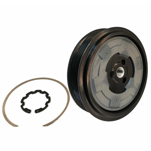 Муфта компрессора кондиционера в сборе. В комплект входит шкив с подшипником, срывная пластина, резинки для срывной пластины, стопорные кольца для подшипника и срывной пластины. Применимость:
