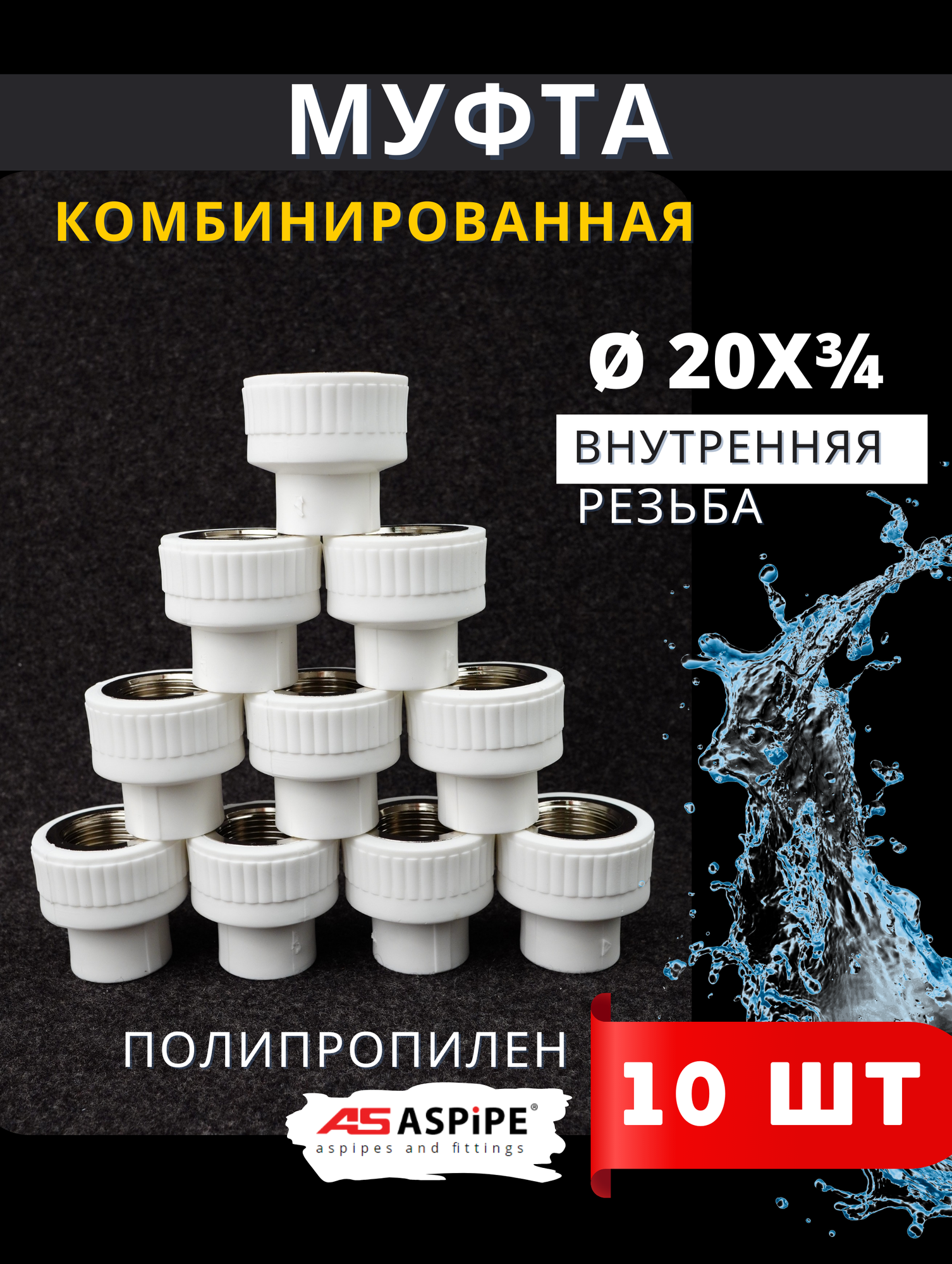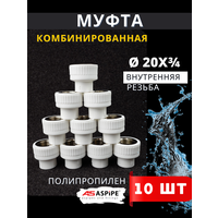 ASPiPE PPRC Муфта комбинированная с внутренней резьбой 20х3/4 применяется для соединения полипропиленовых труб со стальными трубопроводами или запорной арматурой. Резьба нанесена на металлической втулке, запрессованной в корпус из полипропилена. На данную резьбу можно навинтить кран, другую муфту, гайку и др. Муфта комбинированная с внутренней резьбой используются в трубопроводных распределительных системах жилых, административных и промышленных зданиях для транспортировки питьевой и технической воды, в системах отопления. Данная муфта легко совмещается со стальной арматурой, имеет все доступные размеры резьб, чтобы подбор фитингов не затруднил процесс монтажа сантехнических приборов. Характеристики ASPiPE PPRC Муфта комбинированная (вн. рез.) 20х3/4 Максимальное давление - 25 атм; Размер муфты - 20 мм; Размер резьбы - 3/4 дюйм