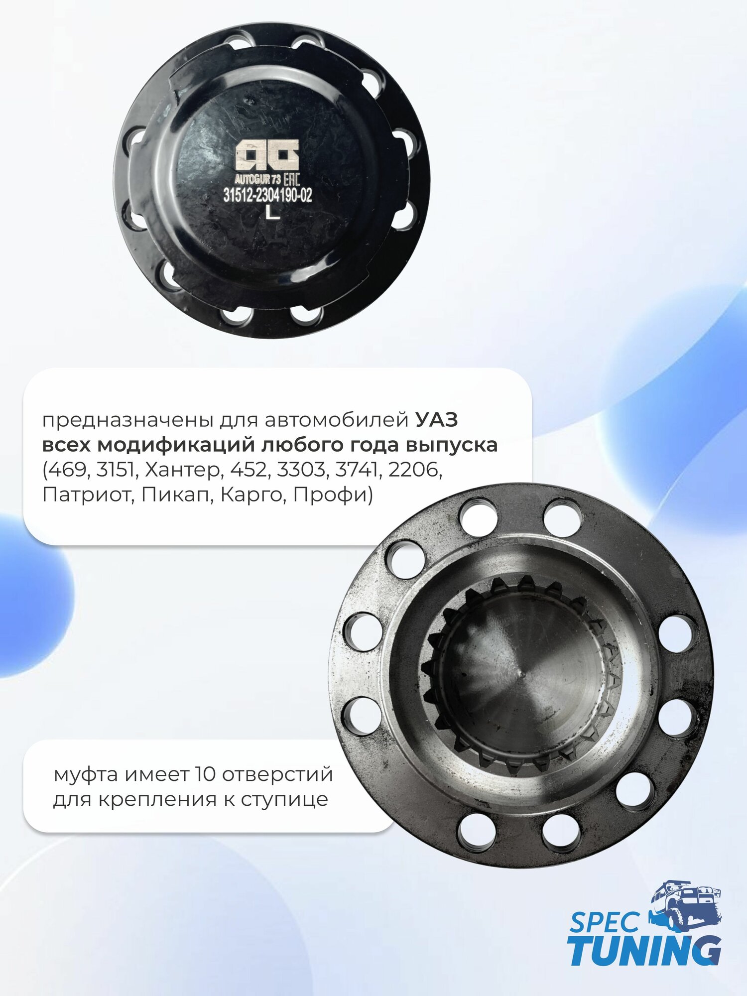Муфта (хаб) предназначена для быстрого отключения (подключения передних колес к приводу автомобилей УАЗ всех модификаций (469, 3151, Хантер, 452, 3303, 3741, 2206, Патриот, Пикап, Карго, Профи) и всех типов мостов (тимкен, спайсер, редукторные, гибридные).