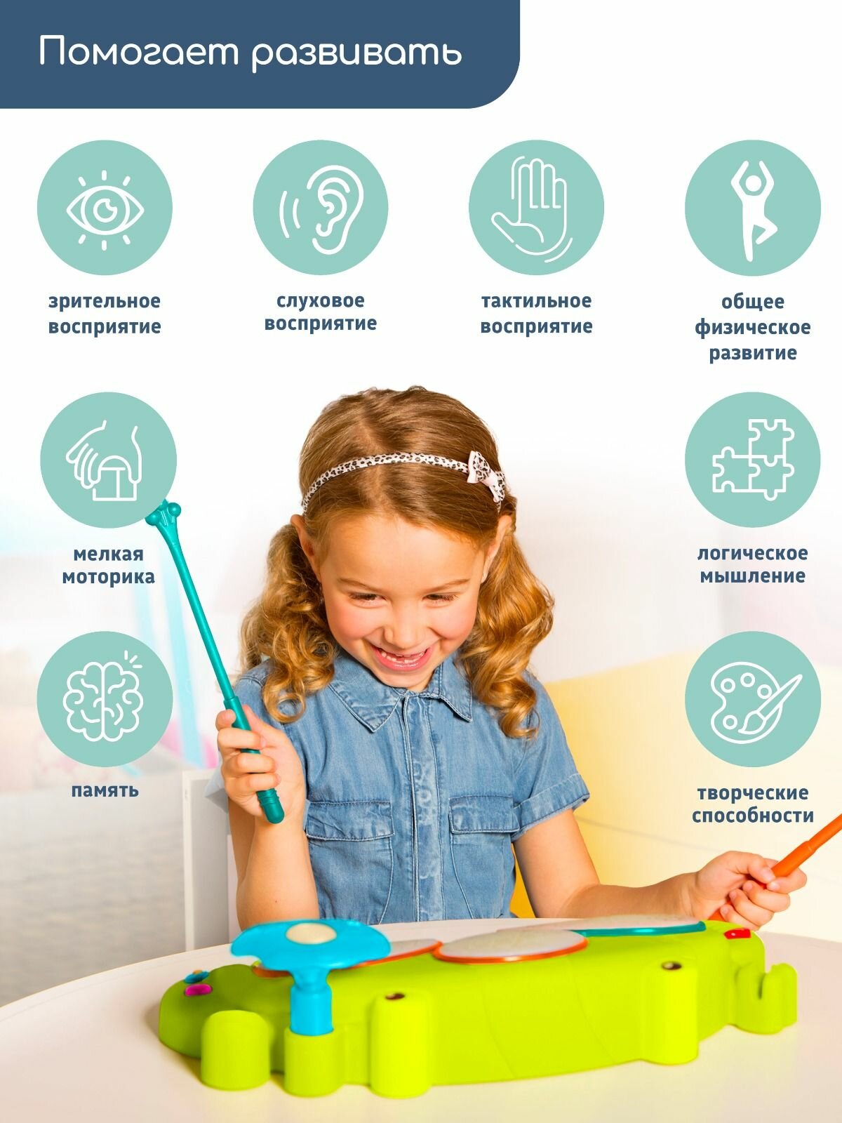 Мульти-барабан "Лягушка" от бренда Battat - это отличный выбор для детей в возрасте от 2 до 7 лет. Этот музыкальный инструмент имеет множество функций и возможностей, которые помогут развивать творческие способности и музыкальный слух ребенка.