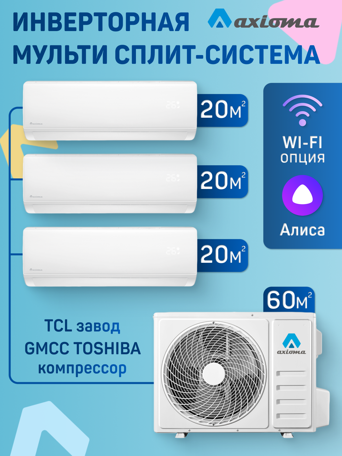 Мульти сплит-система Axioma 21 DC inverter, мощность 7+7+7 BTU, А++ класс, инверторный кондиционер на 60м², на 3 комнаты