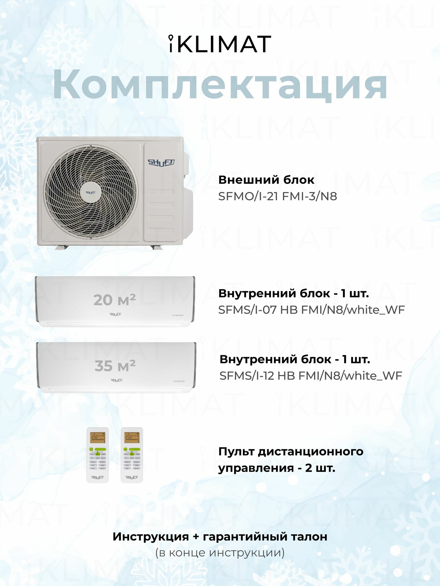 | Подробная комплектация | Блок наружный Shuft SFMO/I-21 FMI-3/N8 инверторной мульти сплит-системы- 1 шт., Блок внутренний Shuft SFMS/I-07 HB FMI/N8 инверторной мульти сплит-системы - 3 шт., Крепления для монтажа на стену (только для внутреннего блока), Пульт ДУ - 3 шт., Инструкция (руководство пользователя), Гарантийный талон. В комплект НЕ входят фреоновые медные трубки, межблочный кабель и кронштейны для наружного блока. |