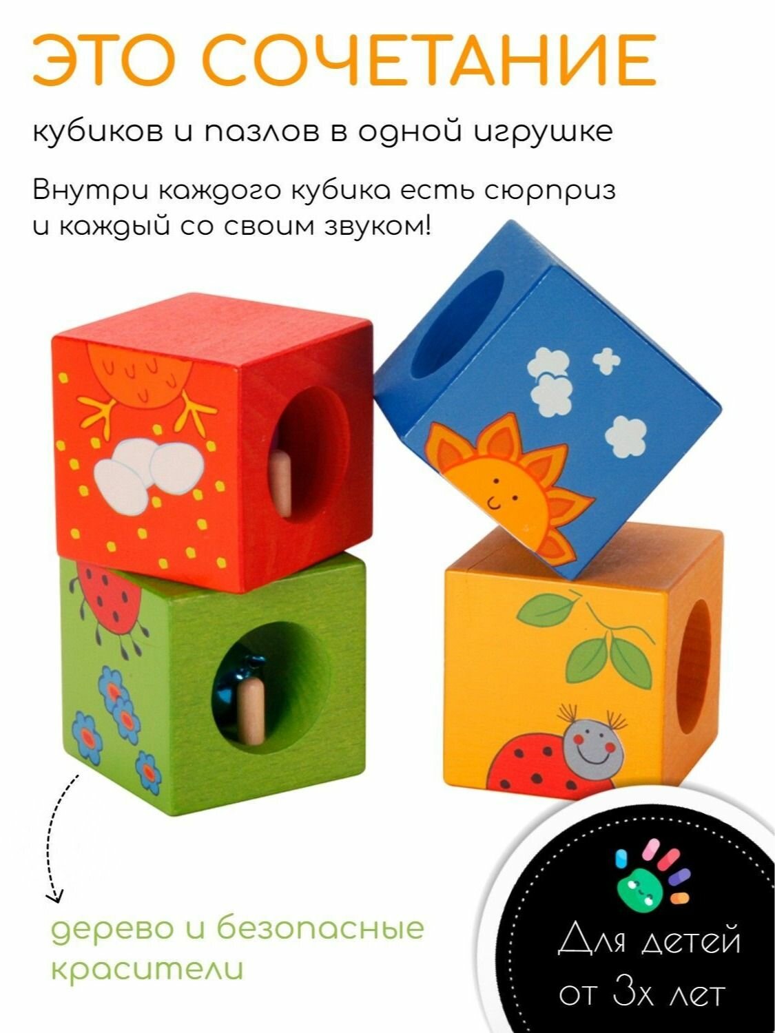 Игрушка выполнена из шлифованного дерева и окрашена красками на водной основе. Абсолютно безопасна для малышей от 2 лет.
