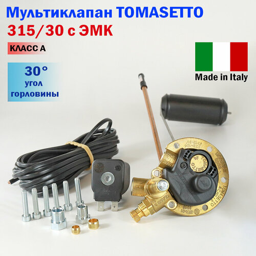 Мультиклапан TOMASETTO с электромеханическим клапаном для цилиндрического баллона диаметром 315 мм с расположением горловины под углом 30°, класс A. Аварийный (скоростной) клапан расходной магистрали, ограничитель 80% наполнения баллона, клапан сброса избыточного давления газа, установленный на 25 бар, электромеханический клапан расходной магистрали. В комплект не входит выносное заправочное устройство.