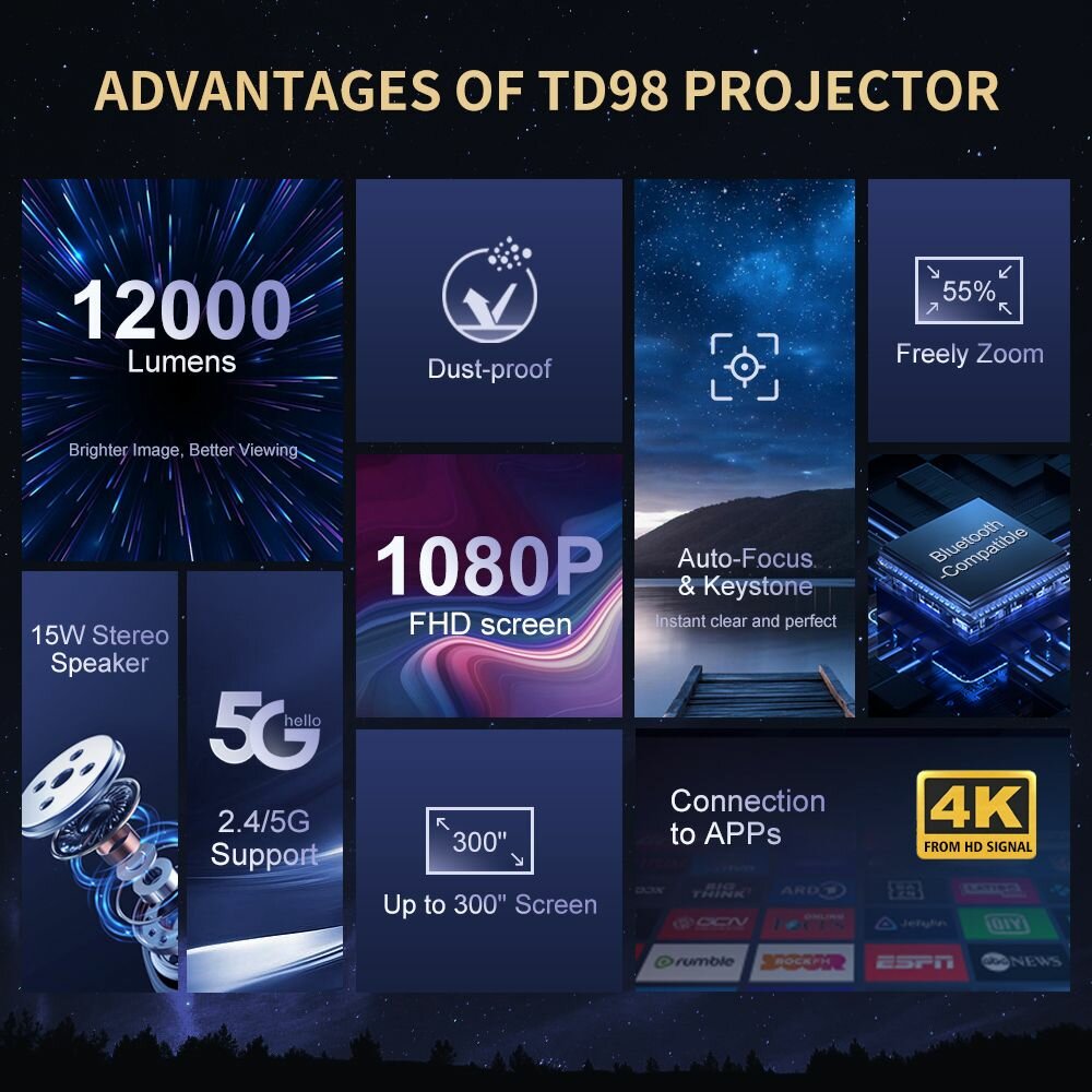 Мультимедийный проектор ThundeaL TD98W FHD разрешением 1080p Wi-Fi 2.4G и 5G Bluetooth Android 9.0 Автофокус YouTube 650 ANSl: сравнение цен, характеристики, фото, актуальное наличие и цены.
