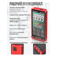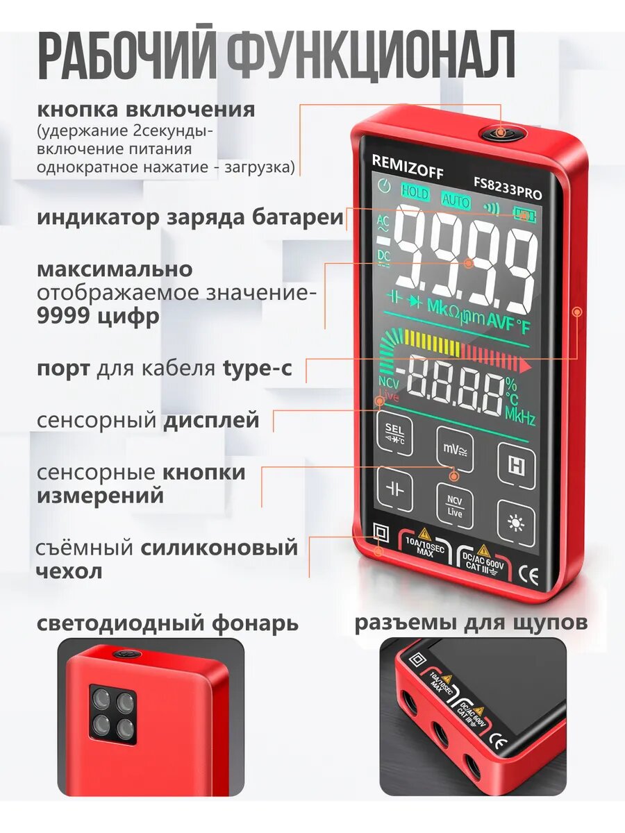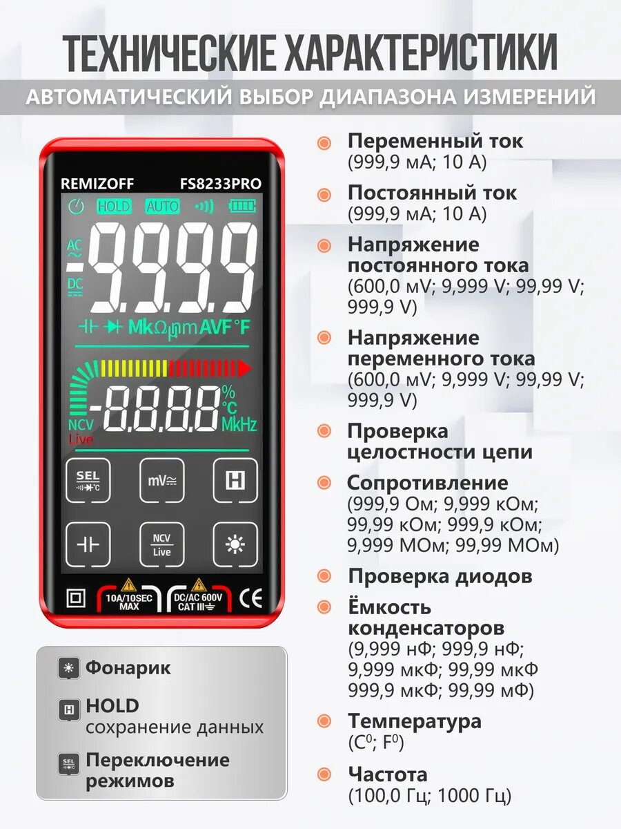 | Особенности | автоматическое выключение, защита от перегрузки, магнитный чехол, подсветка дисплея, фиксация измерений, фонарик |