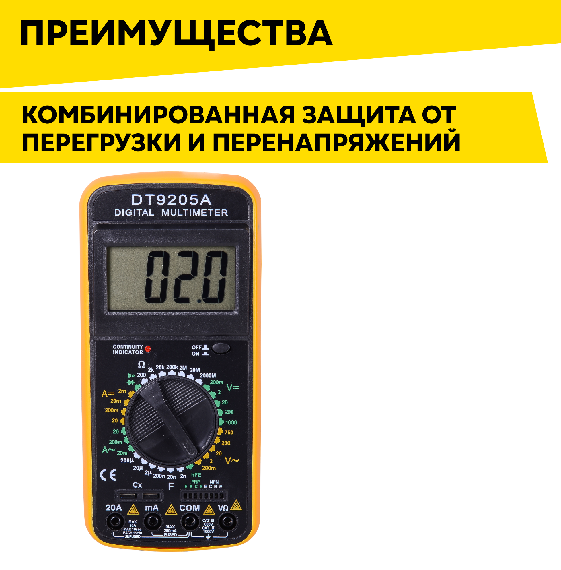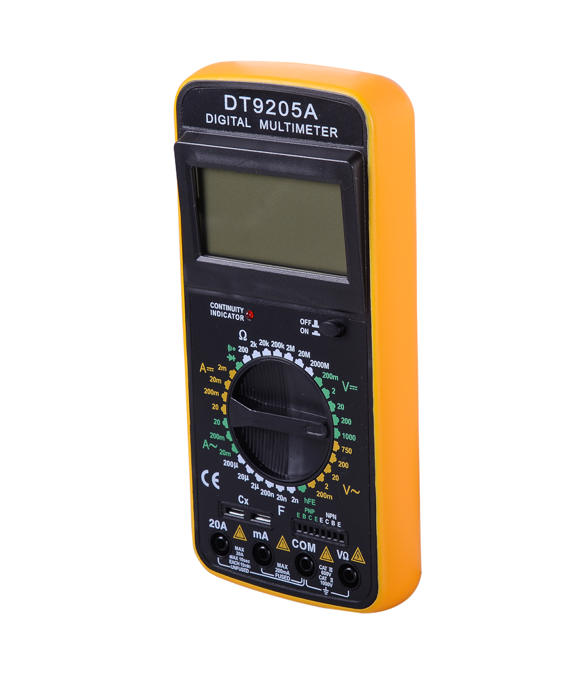 Мультиметр DT9205A предназначен для измерения тока, напряжения, сопротивления, параметров диодов и транзисторов. Прибор многофункционален, портативен, питается от химических источников, удобен при ремонте электрооборудования автомобиля, лабораторных измерений и т. д.