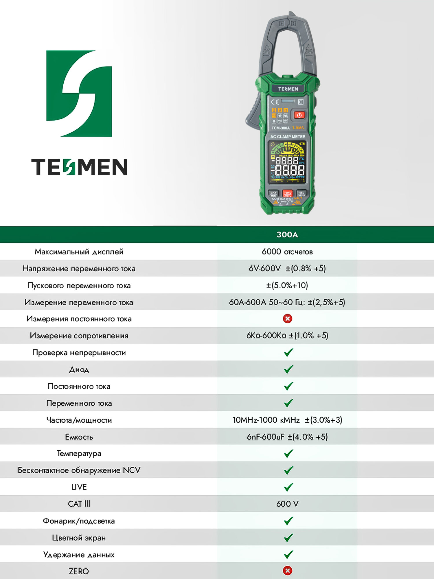 Токовые клещи мультиметр TESMEN TCM-300A — это незаменимый инструмент для профессионалов и автосервисов. Они позволяют быстро и точно измерять ток без необходимости разрыва цепи. Данный мультиметр цифровой с прозвонкой обеспечивает более широкий функционал, позволяя измерять не только переменный ток, но и напряжение переменного и постоянного тока, сопротивление, диод, частоты, емкость, температура, пусковой ток и другие параметры. Мультиметр профессиональный позволяет проводить точные измерения различных электрических параметров, что делает его важным элементом в работе инженеров и техников. Для более универсальных задач можно использовать мультитестер напряжения. Мультиметр автоматический упрощает процесс измерений, автоматически выбирая нужный диапазон, что делает его использование интуитивно понятным даже для новых пользователей. Цифровой мультиметр с токовыми клещами предлагает высокую точность и удобный интерфейс, что позволяет легко считывать данные.