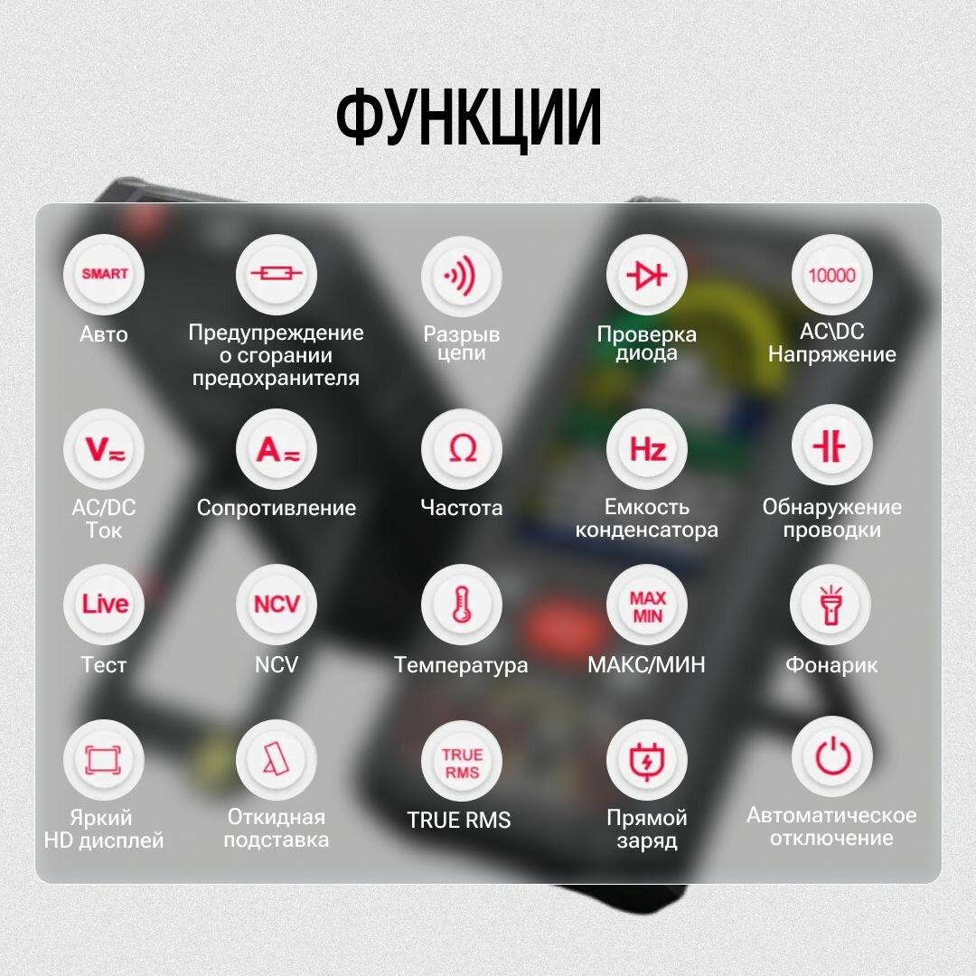 автоматический выбор диапазона измерений, подсветка дисплея, фиксация измерений
