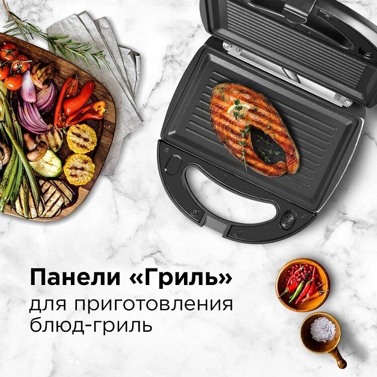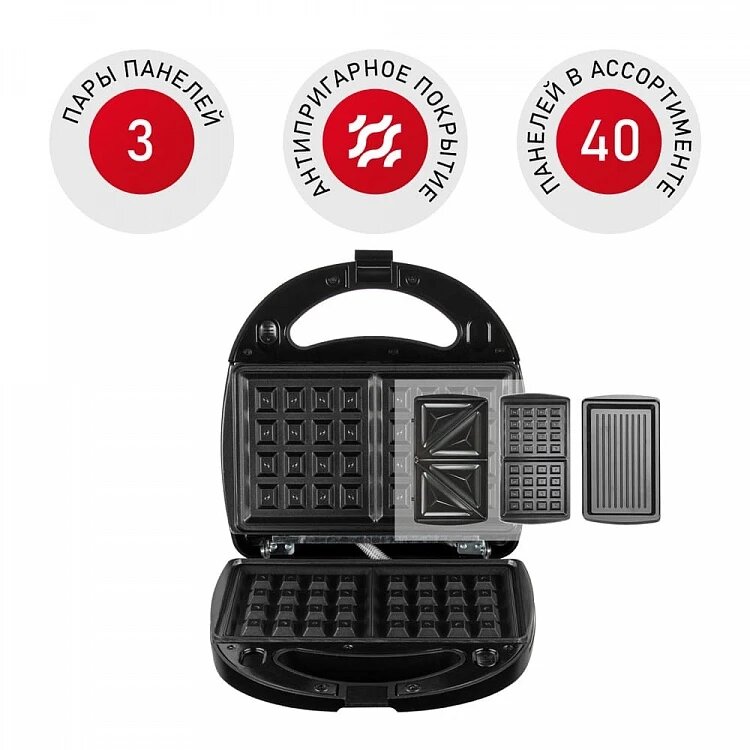 | Особенности | антипригарное покрытие, возможность смены панелей, защита от перегрева, индикатор работы, отсек для хранения шнура |
