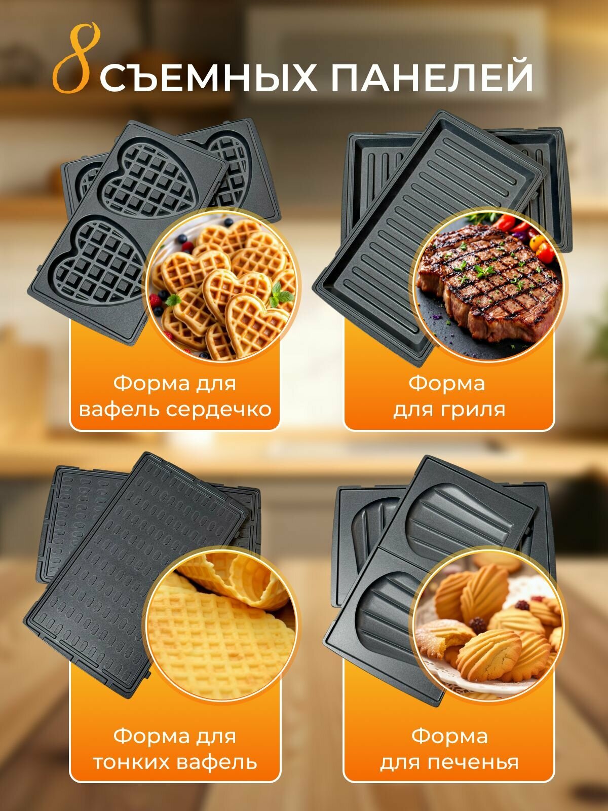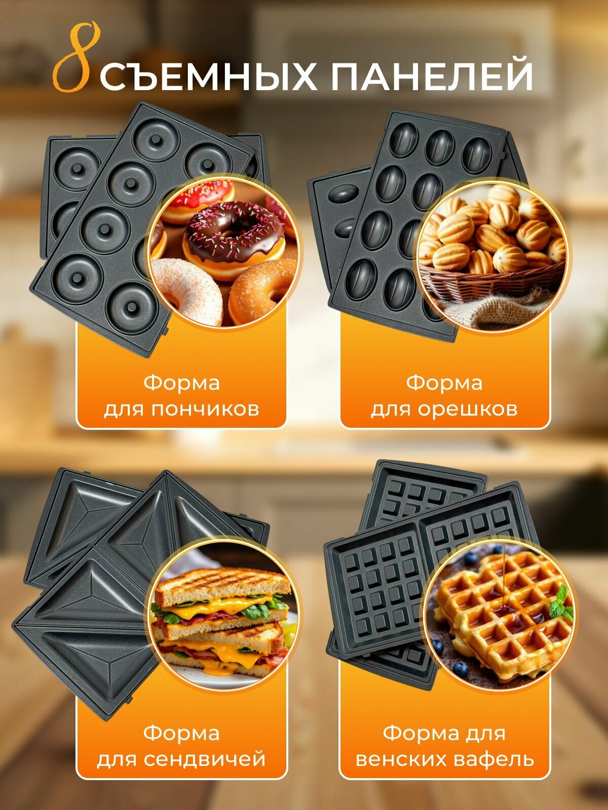 | Вид панели | вафли, выпечка и печенье, гриль, орешки, пончики, ракушки, сэндвичи |
