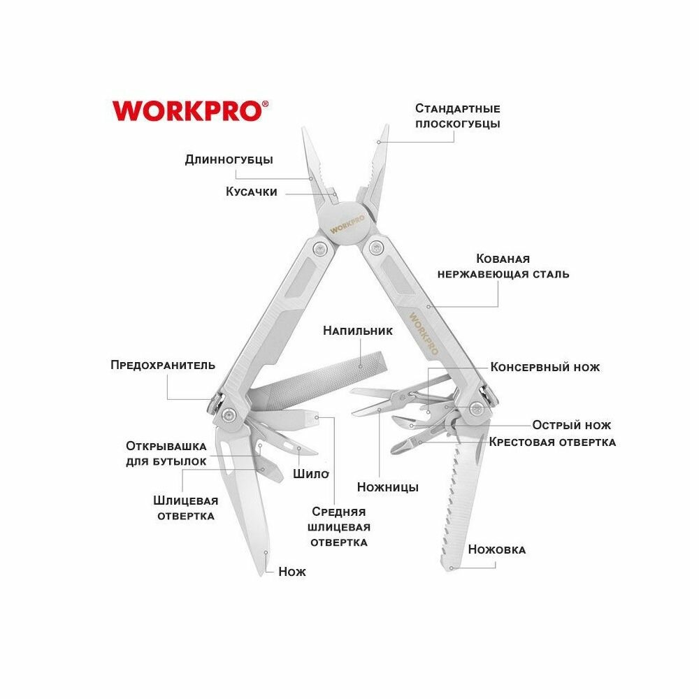 Купить Мультитул 15 в 1, 200 мм WORKPRO с доставкой по всей России. Мультитул 15 в 1, 200 мм WORKPRO: сравнение цен, характеристики, фото, актуальное наличие и цены.