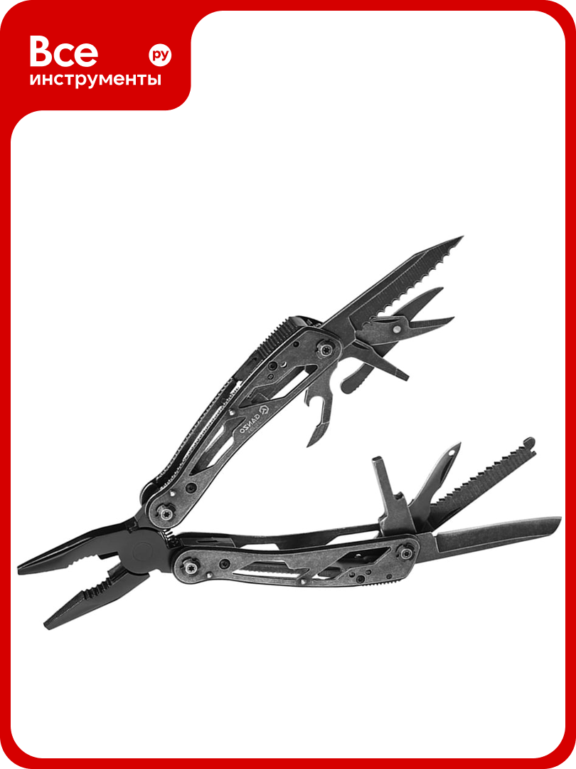 | Инструменты (функции) | захват для гаек, консервный нож, кусачки, нож, ножницы, огниво, острогубцы, отвертка, открывалка для бутылок, пассатижи, пила, плоскогубцы, сменные биты, шило / кернер |