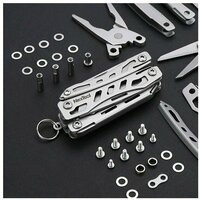 В комплектацию мультитула входят 12 инструментов, изготовленных из качественной стали: консервный нож, открывалка для бутылок, отвертка, нож, плоскогубцы, нож для зачистки проводов, пилка и другие инструменты.