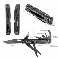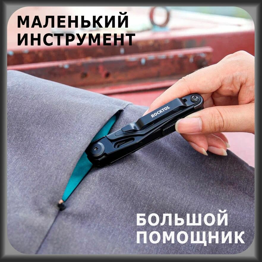Складной карманный нож Rocktol оснащен 12 функциями "все в одном", включая лезвие ножа длиной 6.8 см, большие ножницы, отвертки Phillips, открывалки для банок и бутылок, устройство для снятия проволоки, шило, линейки и многое другое.
