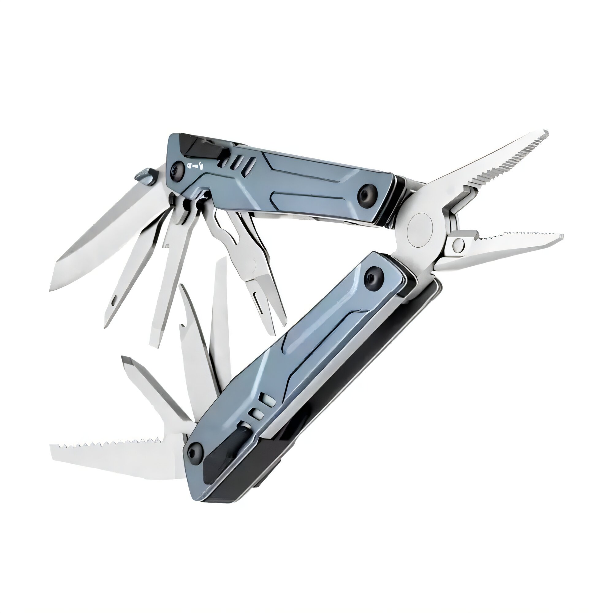 Мультитул оснащается плоскогубцами, пилой по дереву, ножом, серрейторным мини-ножом, крестовидной и плоской, ножницами, шилом, напильником с открывашкой, стропорезом.