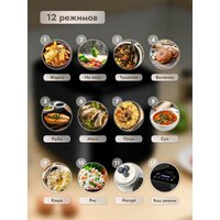 Благодаря 12 программам можно жарить, приготовить плов, пасту, кашу, мясо, суп, йогурт, выпечку, рис, тушить и готовить на пару. Еду можно готовить с отложенным стартом по времени. Функция автоподогрев в мультиварке позволяет поддерживать температуру горячего блюда до 70 градусов в течении 12 часов. Кроме встроенных программ вы самостоятельно можете регулировать температуру, время приготовления, установить таймер. Емкость чаши мультиварки 5литров с антипригарным покрытием. Техника оснащена датчиками температуры и защитой от перегрева.