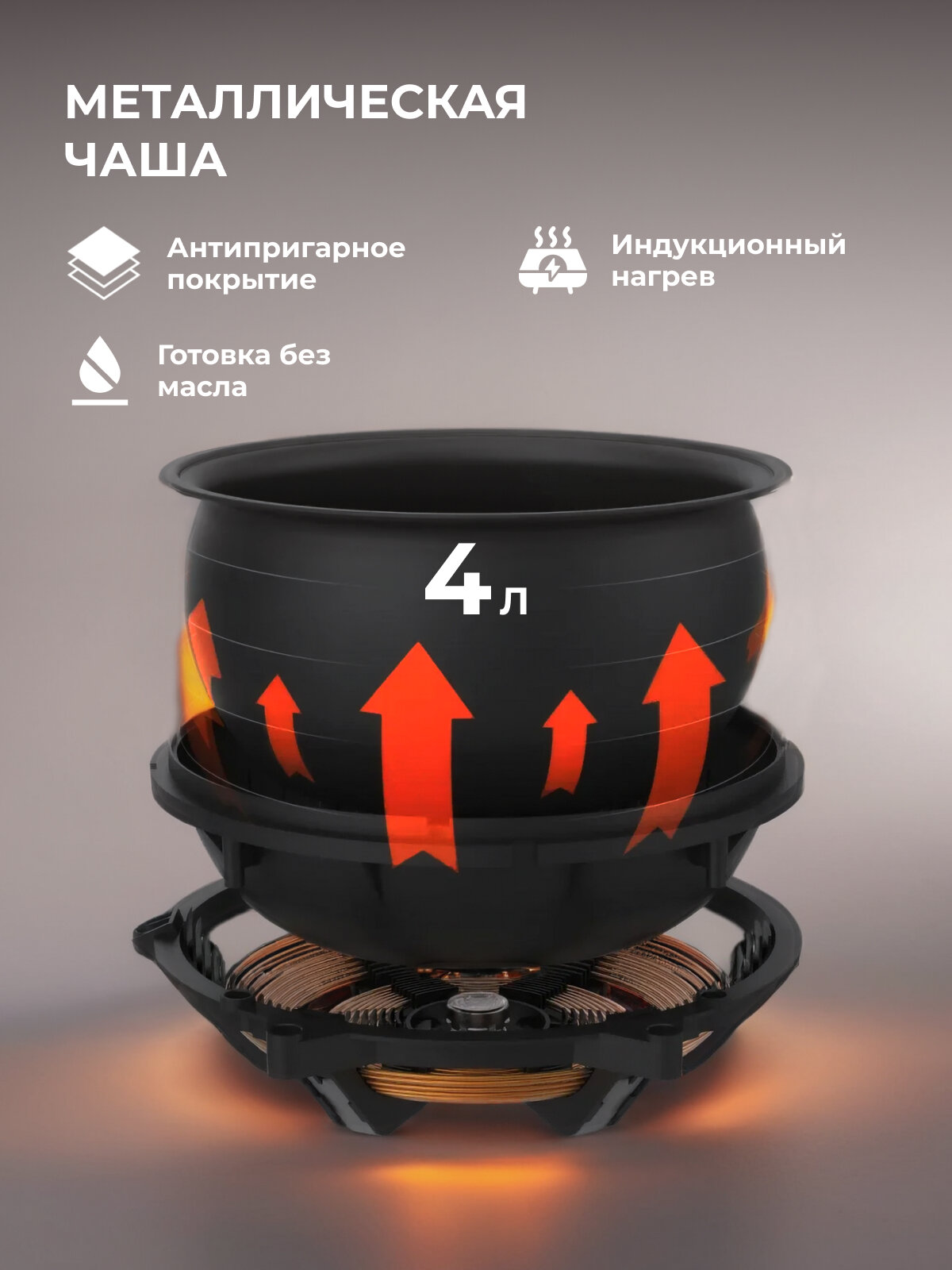 Равномерный нагрев и сферическая форма чаши создают эффект «русской печи» - оптимальная температура приготовления устанавливается быстро и стабильно держится, прогревая продукты со всех сторон.