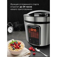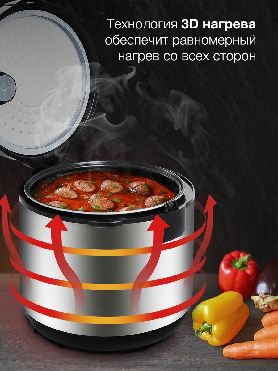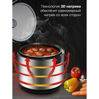 Характеристики: Тип управления: электронное Мощность: 900 Вт Объем чаши: 5 л Сенсорная панель управления: ДА ЖК дисплей: ДА Антипригарное покрытие: ДА Покрытие чаши: тефлоновое Разогрев: ДА Поддержание температуры: ДА Таймер отсрочки старта: ДА Время отсрочки старта, макс: 24 ч Количество автоматических программ: 23 Вес: 2.5 кг Материал корпуса: пластик/нержавеющая сталь Цвет мультиварки: серебристый/черный Возможность изменение времени приготовления блюд: ДА Градуировка чаши: ДА Особенности: 3D нагрев