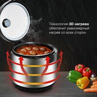 Одним из главных плюсов мультиварки HYUNDAI HYMC-2400 является 3D нагрев. Еда внутри чаши будет нагреваться не только снизу, но и по бокам и сверху. Энергопотребление модели не увеличивается, а блюдо будет готово значительно быстрее. Особенно 3D нагрев будет полезен при приготовлении выпечки. Модель можно легко достать с полки, а после убрать на место благодаря ее небольшому весу в 2.5 кг. Отзывчивое сенсорное управление делает процесс приготовления блюда максимально удобным. Объем чаши мультиварки HYUNDAI HYMC-2400 составляет 5 л. Это считается средним размером, который дает модели два важных преимущества. В ней можно приготовить блюда сразу на четырех человек. При этом пятилитровая чаша не слишком сильно увеличивает габариты (270 х 285 х 270 мм) мультиварки, позволяя хранить ее даже в небольшом кухонном шкафу.