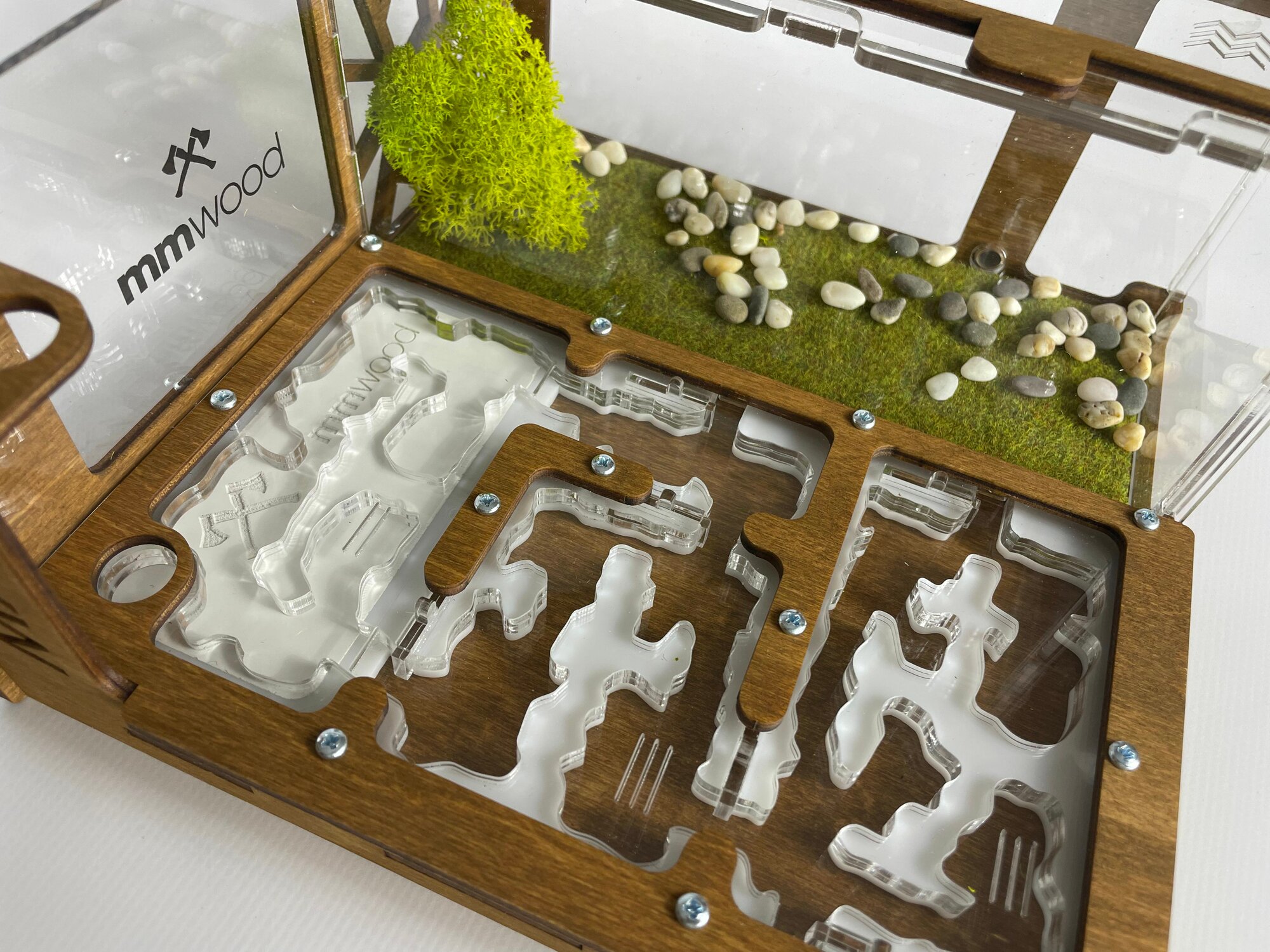 Полностью обновлённая внутренняя архитектура: — теперь у колонии два выхода на арену — продуманная система сквозных проходов между камерами Всё это даёт муравьям естественные маршруты, улучшает логистику и создаёт более гармоничные условия для роста.