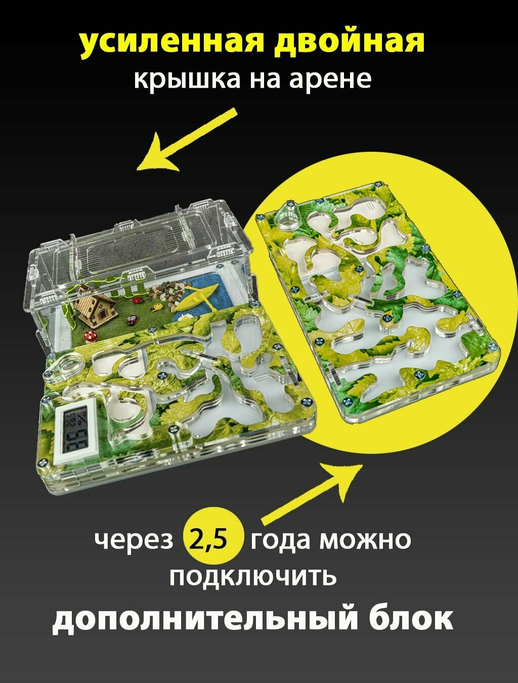 Декор может отличаться от того, что на фото. К ферме бесплатно прилагается базовый комплект: подробная инструкция по уходу, годовой запас корма, поилка, пипетка для увлажнения гипсового блока, песок и камешки для декорирования арены.