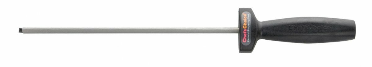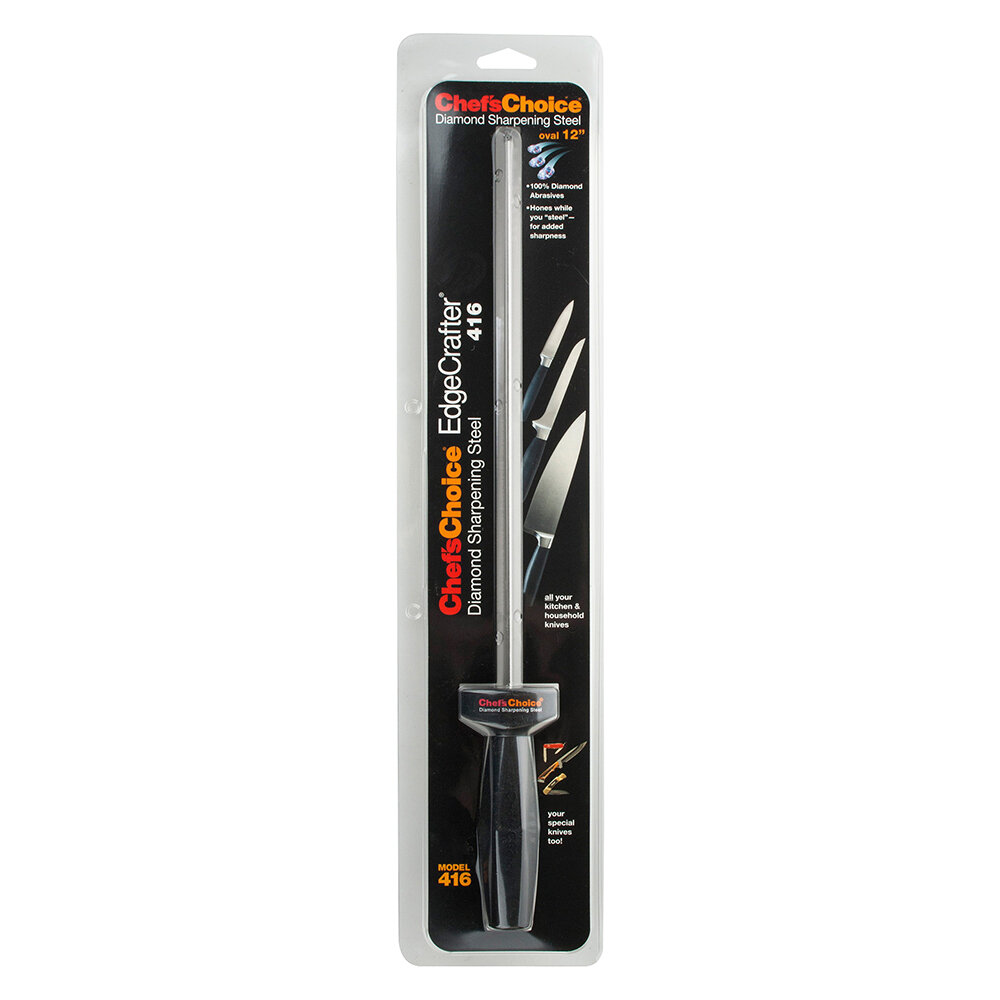 Мусат овальный 30см Chefs Choice CC416-12 Этот стальной мусат с овальным в сечении стержнем, покрытым высокопрочным алмазным абразивом от Chef’sChoice® предназначен для правки и заточи ножей. Его овальная форма обеспечивает большую площадь контакта между клинком и алмазным абразивом. Мусат Chef’sChoice Model 416 легко и идеально сбалансирован, он имеет удобную текстурированную рукоятку для надежного хвата. Его удобно использовать правшам и левшам. Доступен в трех размерах: 20.32 см, 25,4 см, 30,48 см. Мусат разработан и изготовлен в США. Как это работает: мелкий алмазный абразив мягко оттачивает нож, распрямляя замины режущей кромки. Количество кристаллов алмаза и их размер были тщательно подобраны для полировки режущей кромки и выпрямления заминов. Обычные стальные мусаты не затачивают режущую кромку ножа, а просто распрямляют замины. С чего начинается хороший нож? Безусловно, с идеально подобранного материала, с современных технологий производства, с безупречной балансировки и заводской заточки. Однако когда он перестает быть новым, огромное значение приобретает инструмент, с помощью которого ножу возвращается острота. И тогда на помощь приходят механические и электрические точилки американского бренда Chef's Choice.