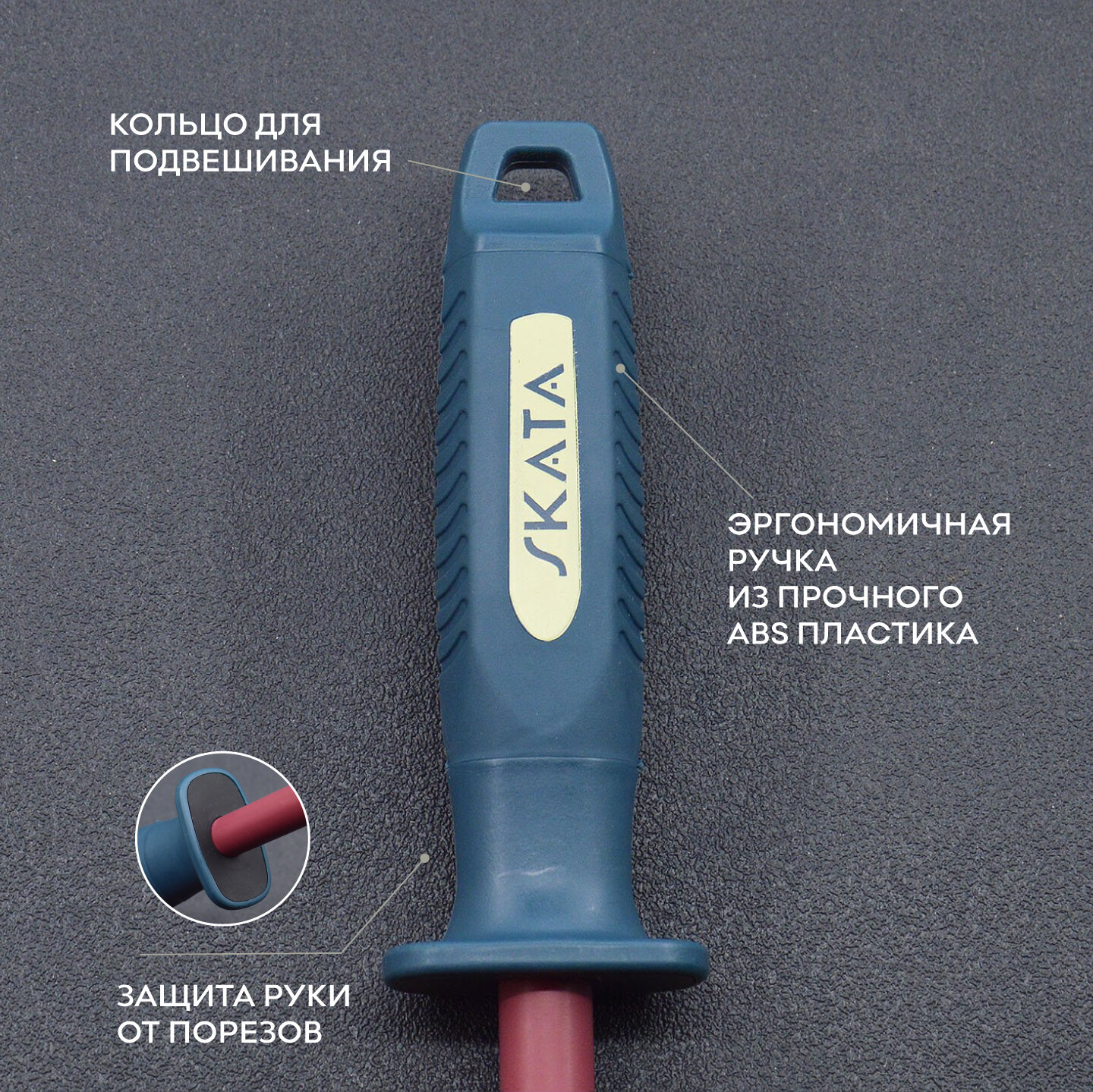 - Удобно держать. Мусат SKATA оснащён удобной эргономичной рукояткой, которая отлично лежит в руке и позволяет удобно работать с ножами любого вида.