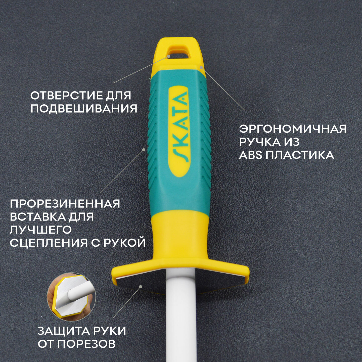 Эргономичная, противоскользящая рукоять - мусат SKATA оснащён удобной прорезиненной рукояткой - он отлично лежит в руке, позволяет удобно работать с ножами любого вида, обеспечивает удобный и безопасный захват.