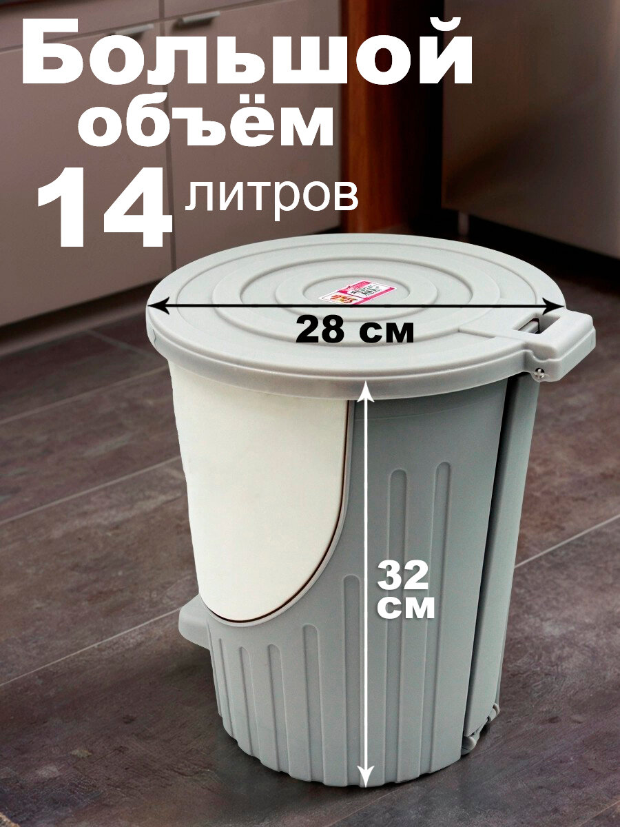 - Универсальность: благодаря своему объему 14 литров, это ведро подходит для хранения различных видов мусора, включая пищевые отходы, бумагу, подгузники и другие бытовые отходы. Оно идеально подходит для использования в кухне, ванной комнате или офисе.