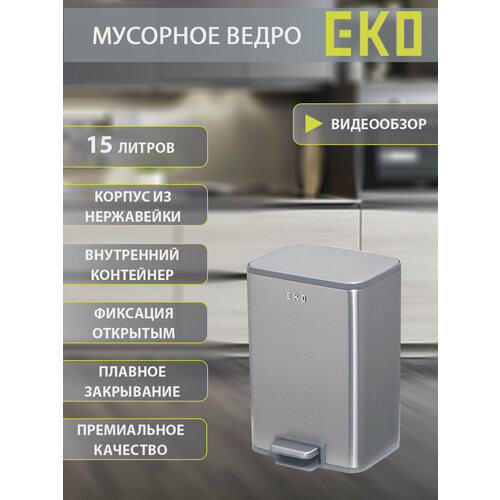Мусорное ведро с педалью EKO серии MARINA STEP BIN модель EK9161MMT-15L, премиального класса, 15 литров, прямоугольной формы, изготовлено из высококачественной благородной нержавеющей стали, со специальным ультра-матовым защитным покрытием, предохраняющим корпус изделия от появления жирных отпечатков пальцев. Корпус модели EK9161MMT-15L благодаря ультра-матовому финальному покрытию имеет четкие элегантные очертания, идеально гармонирующие с современными интерьерами жилых, офисных и вспомогательных помещений.