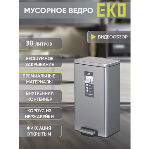 Педальное мусорное ведро EKO серии MADISON STEP BIN модель EK9361MMT-30L, премиального класса, 30 литров, прямоугольной формы, изготовлено из высококачественной брашированной нержавеющей стали, со специальным ультра-матовым защитным покрытием, предохраняющим корпус изделия от появления жирных отпечатков пальцев. Корпус мусорного ведра благодаря ультра-матовому финальному покрытию имеет четкие элегантные очертания, идеально гармонирующие с современными интерьерами жилых, офисных и вспомогательных помещений. Внутри корпуса расположен вставной полипропиленовый контейнер полезной емкостью 30 литров, на который легко крепится мусорный мешок. Для удобства крепления мусорного мешка, внутренний полипропиленовый контейнер оснащен специальным фиксирующим отверстием, в которое заправляются излишки горловины мусорного мешка, что позволяет полностью скрыть мусорный мешок от глаз пользователя. Крышка мусорного ведра оснащена отсеком для дезодоранта, который позволяет использовать для освежения запаха губку, смоченную ароматическим маслом с ароматом на вкус пользователя. Мусорное ведро оснащено устройством плавного бесшумного закрывания крышки, что позволяет избежать при закрывании крышки звонкого хлопка, присущего дешевым мусорным ведрам. Также крышка изделия оснащена фиксатором, позволяющим фиксировать крышку в открытом положении как на время смены мусорного мешка, так и на время приготовления званного ужина для удобства быстрого выбрасывания отходов. Педаль мусорного ведра модели EK9361MMT-30L имеет комфортную ширину, что позволяет с легкостью попасть ногой на педаль без излишнего “прицеливания”. Основание изделия оснащено противоскользящими подпятниками, исключающими скольжение корпуса в процессе эксплуатации. Полезный объем изделия 30 литров позволяет выбрасывать упаковки и крупные отхода без дополнительного сминания.