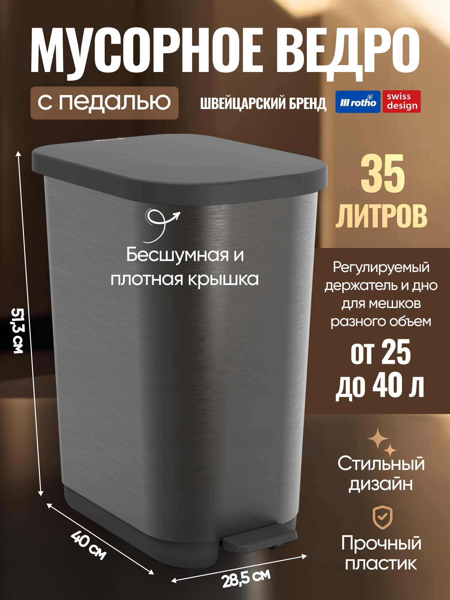 Мусорное ведро с педалью для кухни, дома и офиса, Rotho Ribo 35 л, графит: сравнение цен, характеристики, фото, актуальное наличие и цены.